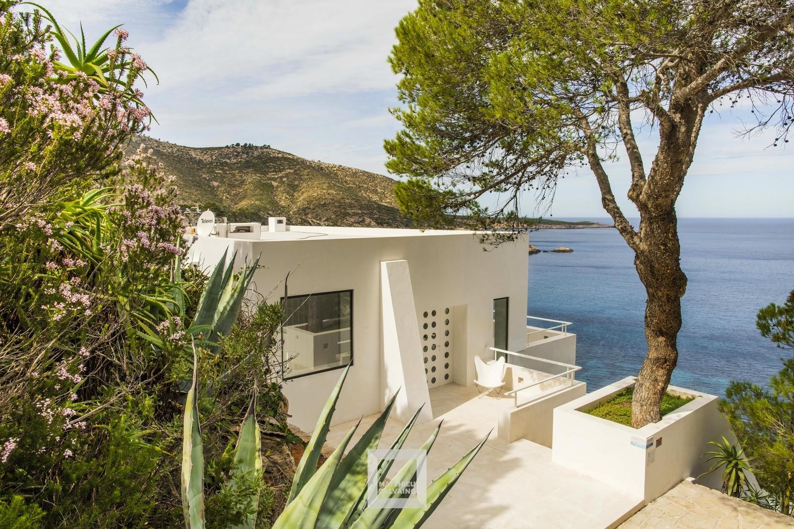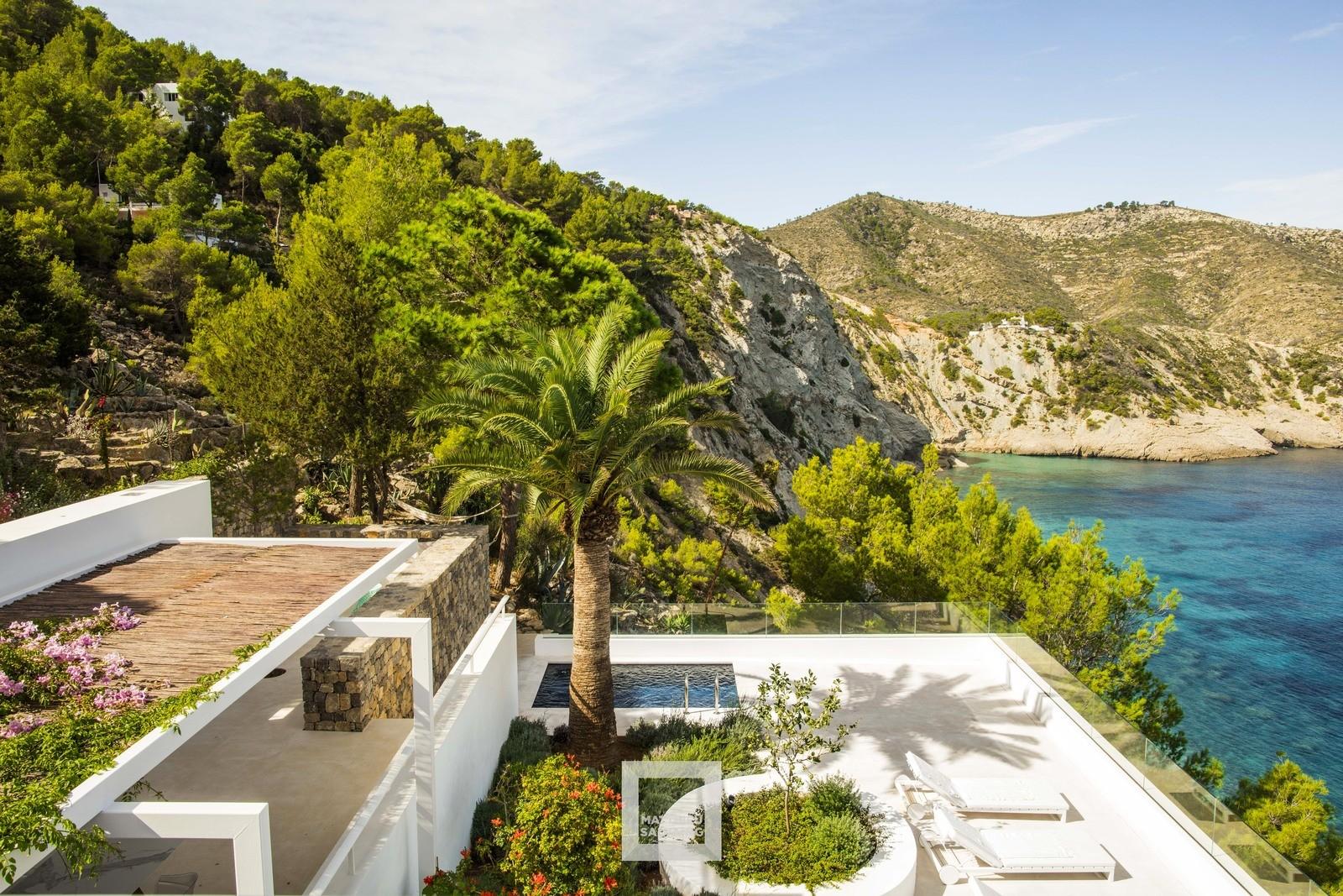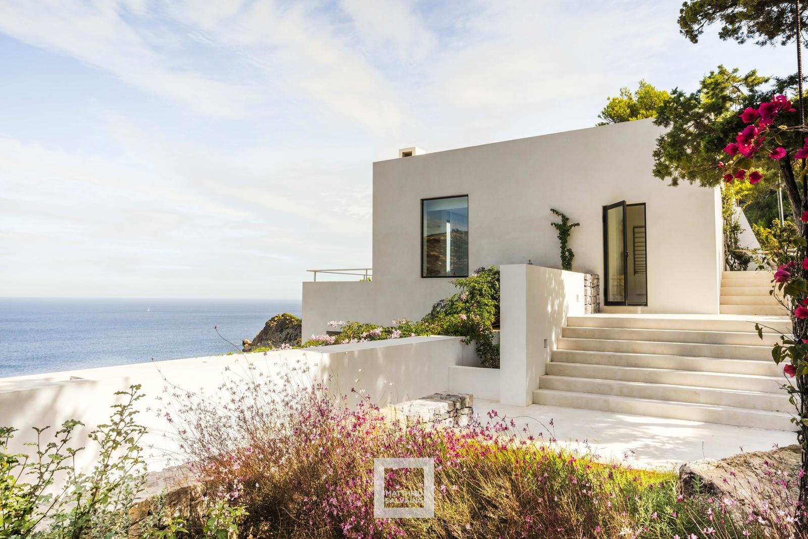 Простые белые объёмы формируют композицию многоуровневой постройки, спускающейся ступенями по крутому берегу к морю. Несколько террас, на которых расположились небольшой бассейн, сад и обеденный стол, открывают широкий вид на великолепный пейзаж острова.