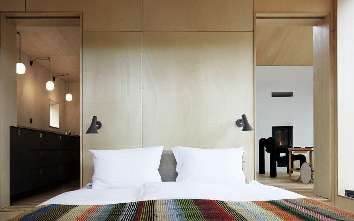 Несмотря на относительно небольшую площадь в 65 квадратных метров, дом выглядит просторным за счет разноуровневых потолков. Внутри расположены гостиная, спальня, кухня, небольшое подсобное помещение для лыж и прочего спортивного снаряжения. В спальне, над головой у хозяев, проделано широкое оконное отверстие, сквозь которое по ночам можно любоваться северным сиянием.