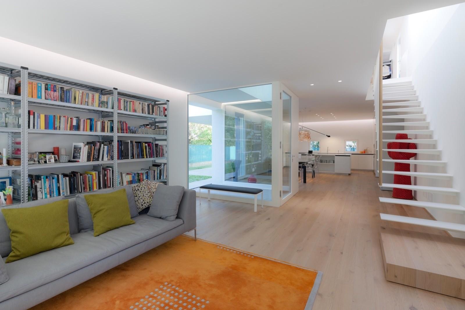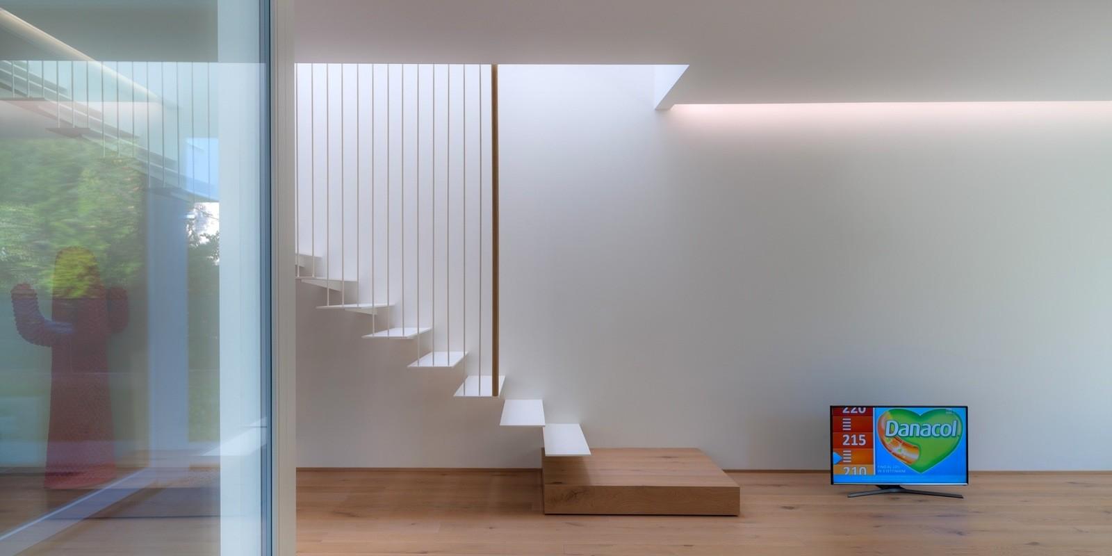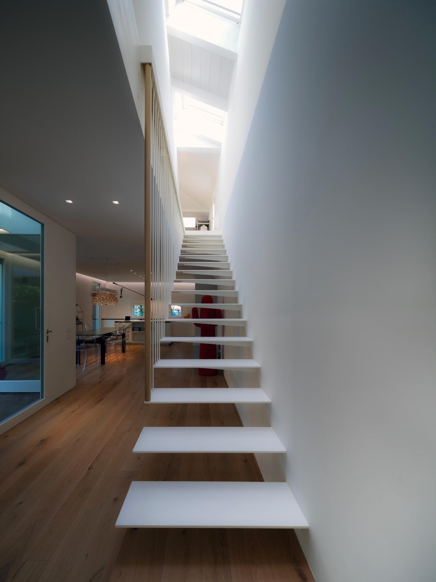 Новый дом имеет Т-образную форму, причём основу пространственной ориентации составляет вертикальная циркуляция, возможная благодаря связующему архитектурному элементу в виде лестницы. Блок второго этажа немного смещён относительно нижнего уровня, что придаёт объекту уникальность.
