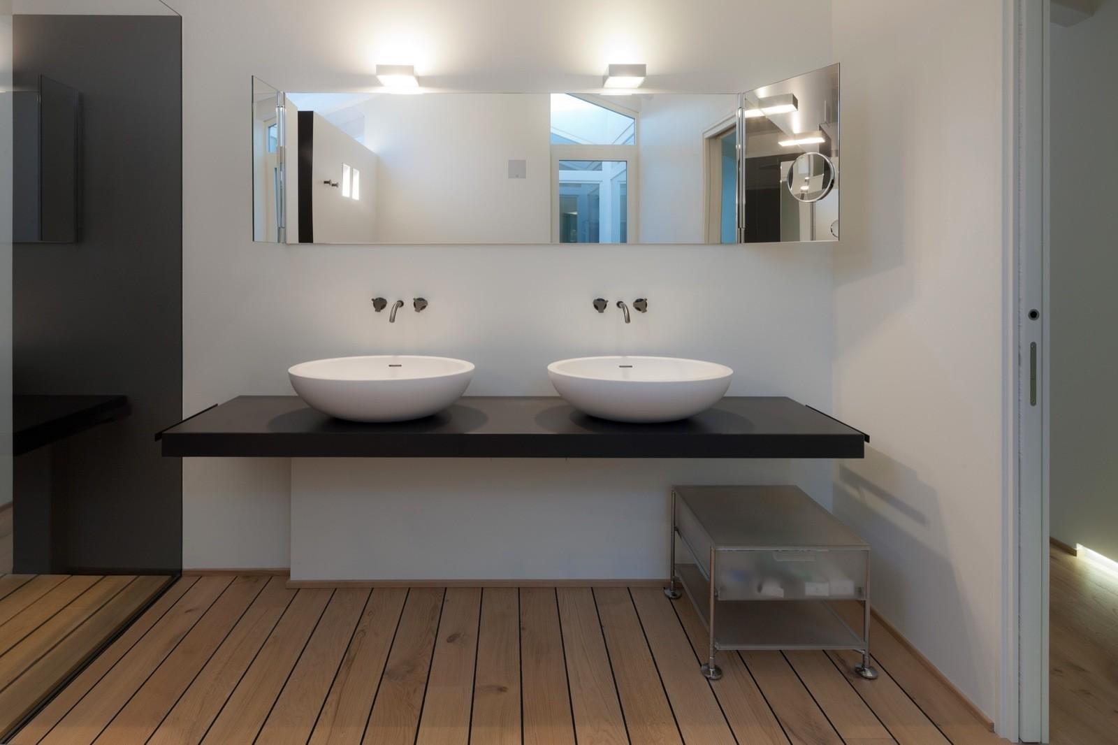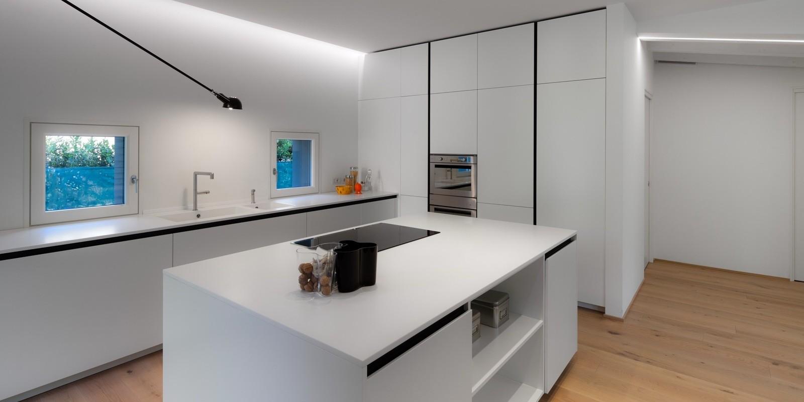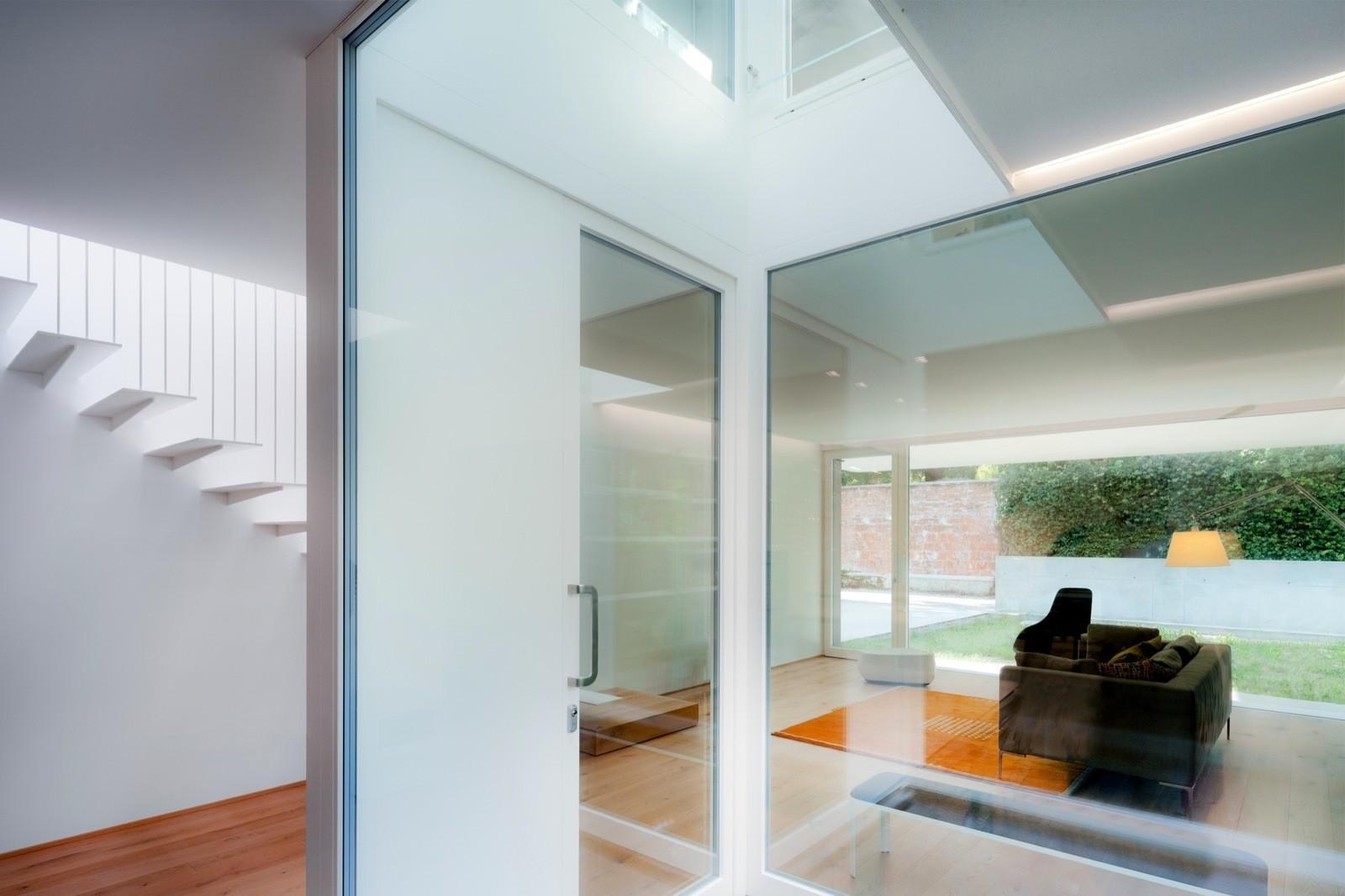 Новый дом имеет Т-образную форму, причём основу пространственной ориентации составляет вертикальная циркуляция, возможная благодаря связующему архитектурному элементу в виде лестницы. Блок второго этажа немного смещён относительно нижнего уровня, что придаёт объекту уникальность.