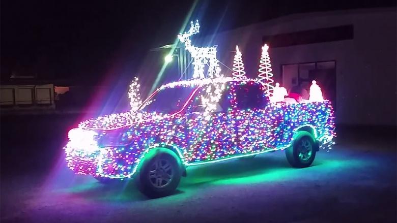 Помимо 14 тысяч светодиодов, ковром устеливших кузов, включая колеса, место нашлось для пары спиралевидных елочек, рогов сбоку и оленя на крыше.
