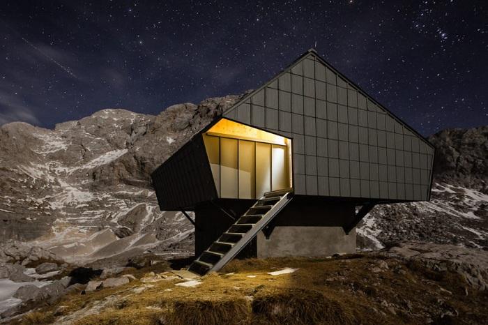 Высоко в горах в национальном словенском парке Триглав (Slovenia’s Triglav National Park) появилась оригинальная хижина для альпинистов. Она переделана из полуразвалившегося бункера времен Первой мировой войны. Теперь те, кто задержался на заснеженной вершине до темноты, смогут провести ночь в этом убежище.
