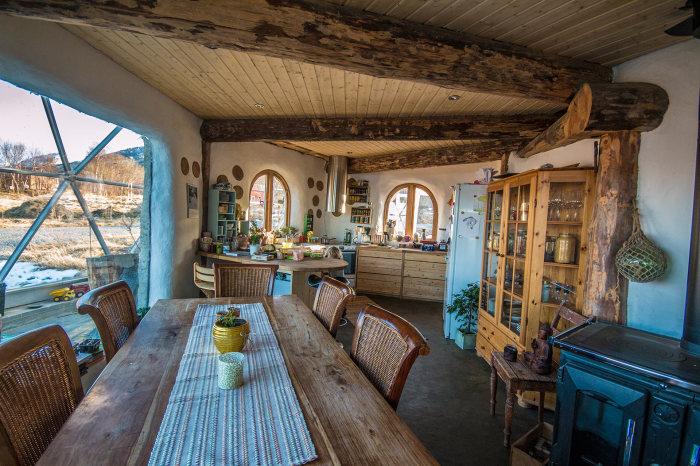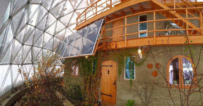 Семья из шести человек живет в экологически чистом доме Naturhus. Сама трехэтажная постройка площадью 180 квадратных метров выполнена из глины и соломы. Снаружи дом накрыт геодезическим куполом. Такое решение значительно повысило температуру под стеклом. К тому же, возле дома есть несколько грядок.