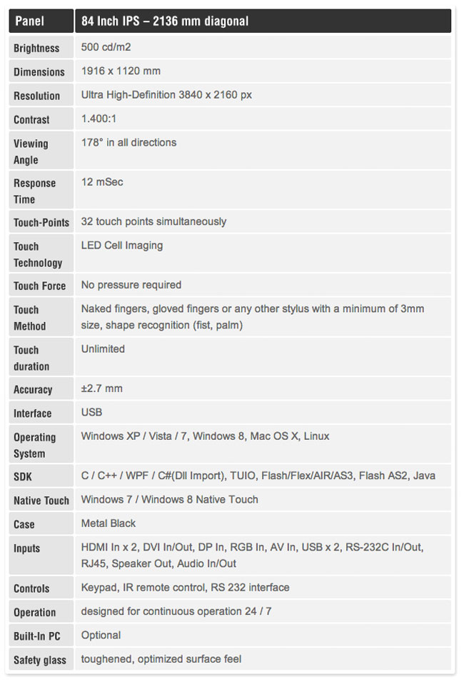 Если вы ищите нечто большее, чем 9,7-дюймовый iPad или 10.1-дюймовый Galaxy Tab, то обратите внимание на огромную 84-дюймовую 4K сенсорную панель MyMultitouch Alvaro GIANT, у которой помимо гигантского названия и размера еще и не менее гигантская цена в 43 тысячи долларов. Эту новинку с разрешением экрана 3849 x 2160 пикселей в настоящий момент демонстрируют на выставке электроники CeBit.