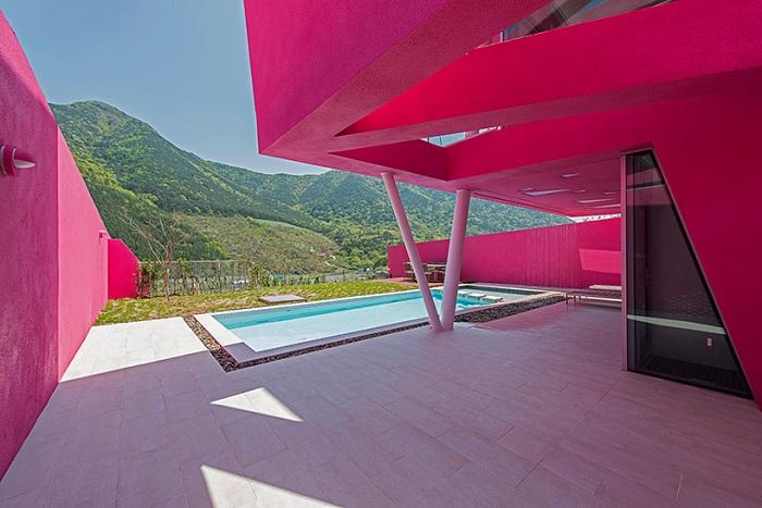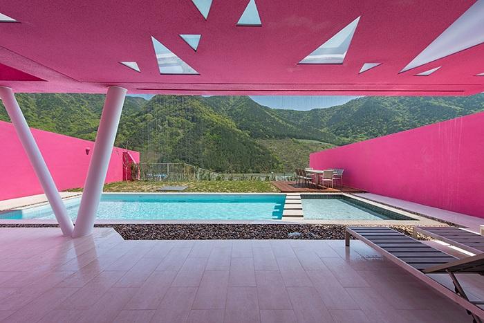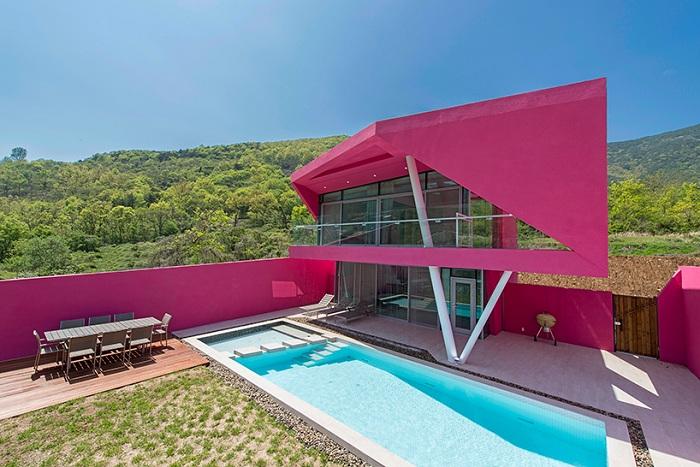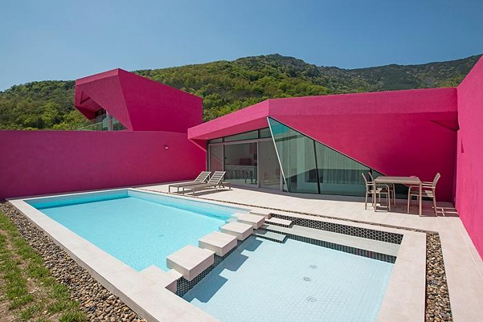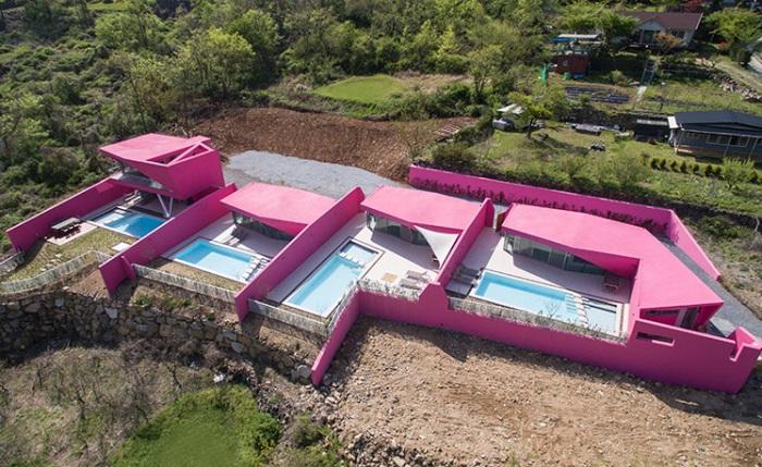 Архитекторы студии Moon Hoon славятся нестандартными проектами. В этот раз они снова решили удивить очередного заказчика. Относительно недавно было завершено строительство четырех вилл (Miryang pool villa), расположенных в окрестностях портового города Ульсан (Южная Корея). Дома выполнены в ярко-розовом цвете.