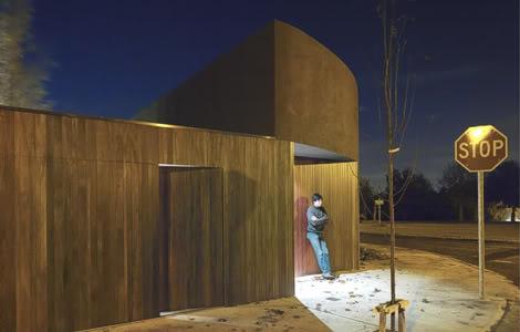 Чтобы использовать ситуацию наиболее выгодно, было решено наполовину опустить этаж в землю, что увеличило площадь здания. Крышу сделали низкой, обеспечив ей поддержку консолью. Вышло так, будто двухэтажный объект частично «затонул» под линией земли.