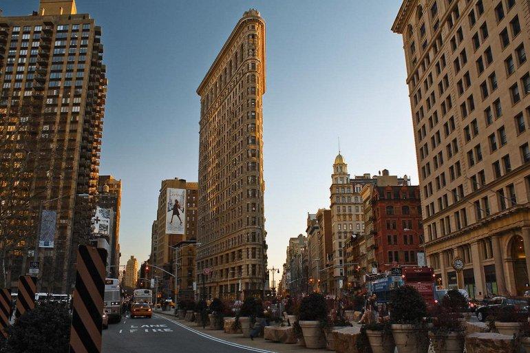 Флэтайрон-билдинг был спроектирован Дэниелом Бернэмом Чикаго как небоскреб стальной конструкции, одетый в белую терракоту. 21 этажное здание высотой 93 метра на момент постройки было одним из самых высоких в Нью-Йорке. При этом ошибочно полагать, что оно было самым высоким в мире, или даже самым высоким в Нью-Йорке. Тем не менее, исключительная форма и видное расположение быстро сделали Флэтайрон одной из самых известных достопримечательностей Нью-Йорка.