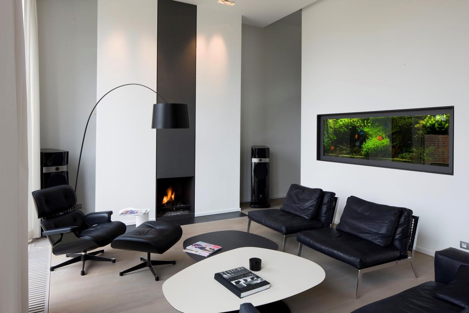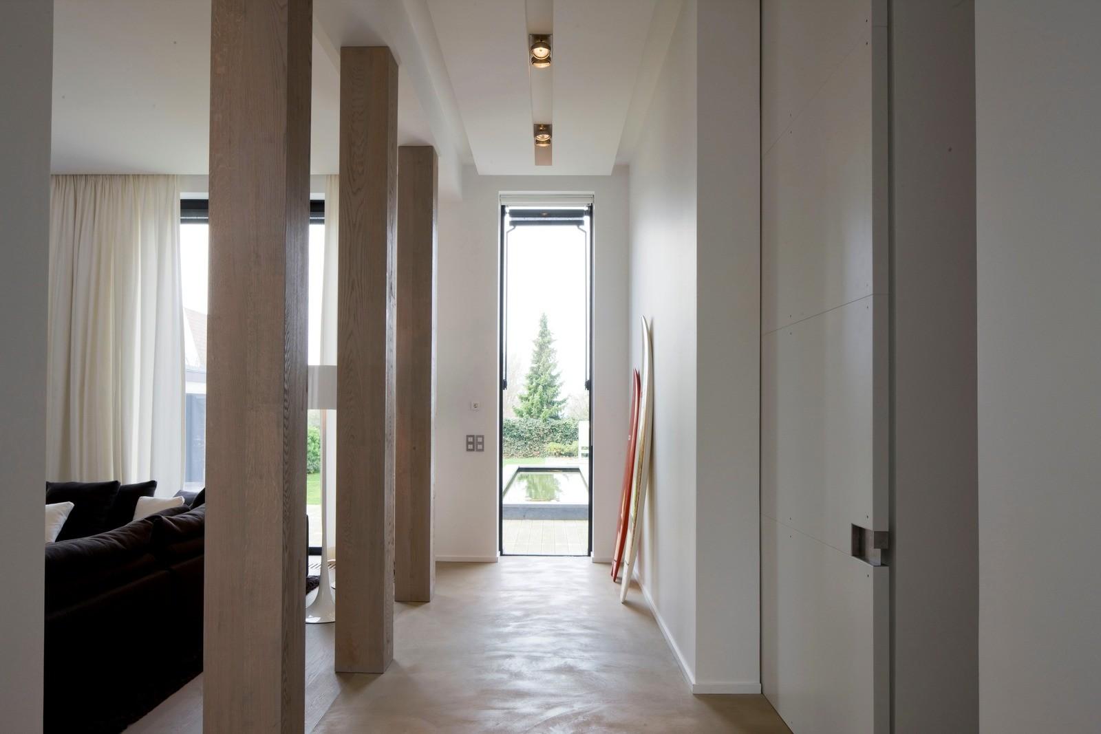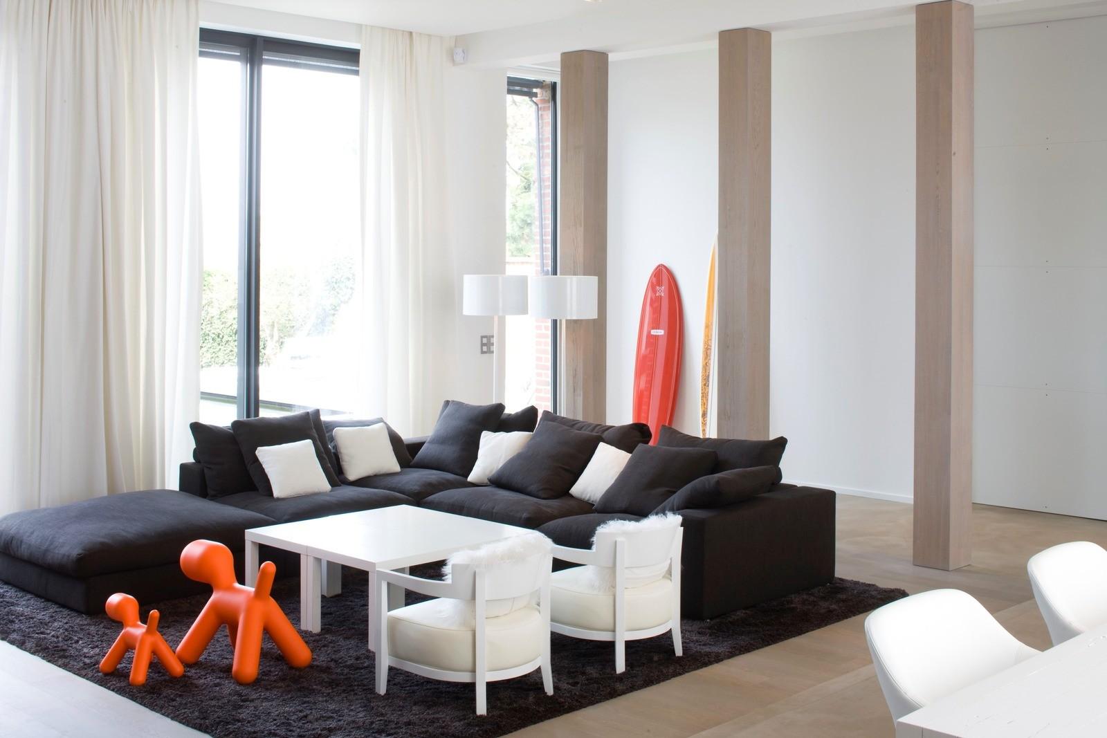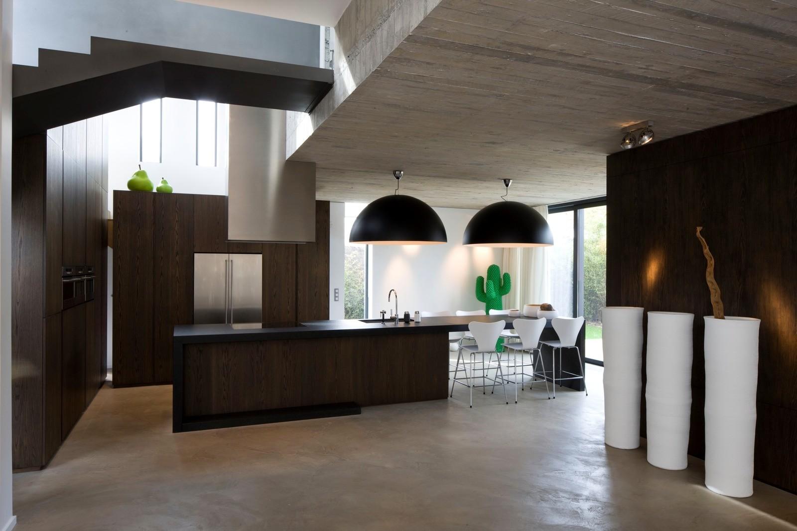 Проектируя интерьер и экстерьер, архитекторы стремились к созданию выигрышных перспектив, работали с идеей симметрии и играли с пропорциями объёмов. Созданные в результате безупречные пространства имеют эффектную отделку материалами разных фактур — это белоснежная штукатурка, сырой бетон, матовый тонированный дуб. Тщательно продуманная система освещения создаёт нужную атмосферу в каждом уголке дома.