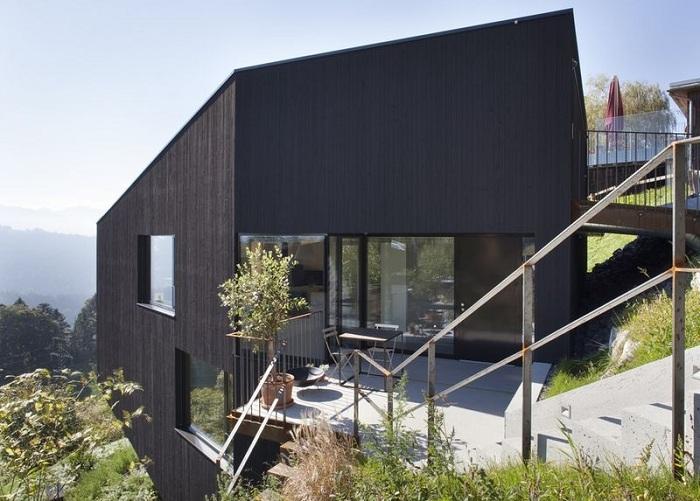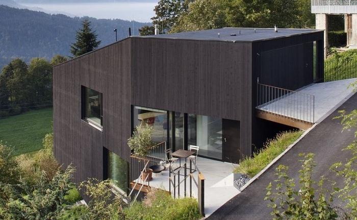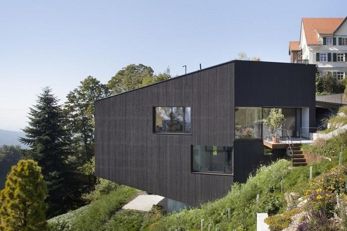 Архитектурная фирма Dietrich│Untertrifaller Architects спроектировала коттедж площадью 169 квадратных метров под названием House Sch. Учитывая тот факт, что дом построен на наклонном участке, цокольный этаж построен из бетона, необходимого для прочности. Темная консольная часть дома эффектно выпирает над обрывом.