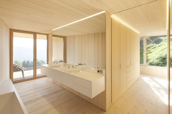 Ярусом выше находятся гостиная, спальни и ванная. В гостиной есть камин, который добавляет уюта помещению. Из каждой комнаты открывается прекрасный вид на Альпийские горы.