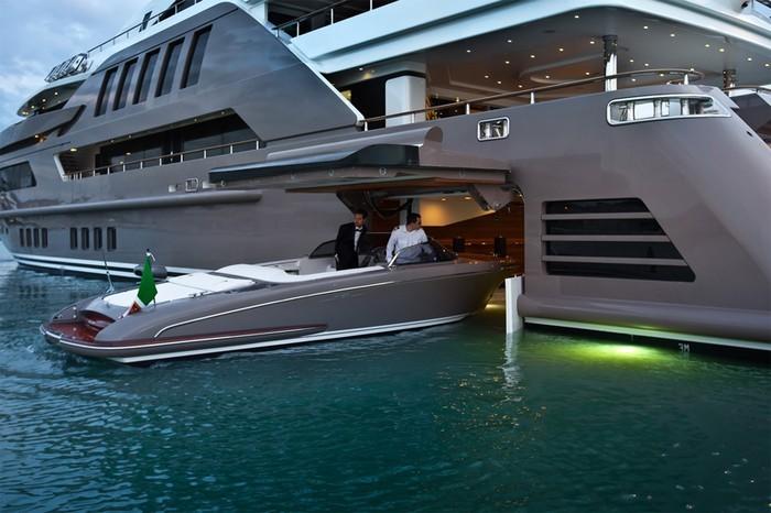 Для этого в борту J’ade есть специальный отсек, который можно открыть дистанционно. Внутри расположен небольшой бассейн, являющийся гаражом для лодки. Заполнить этот резервуар водой, как и спустить ее, можно всего за три минуты.