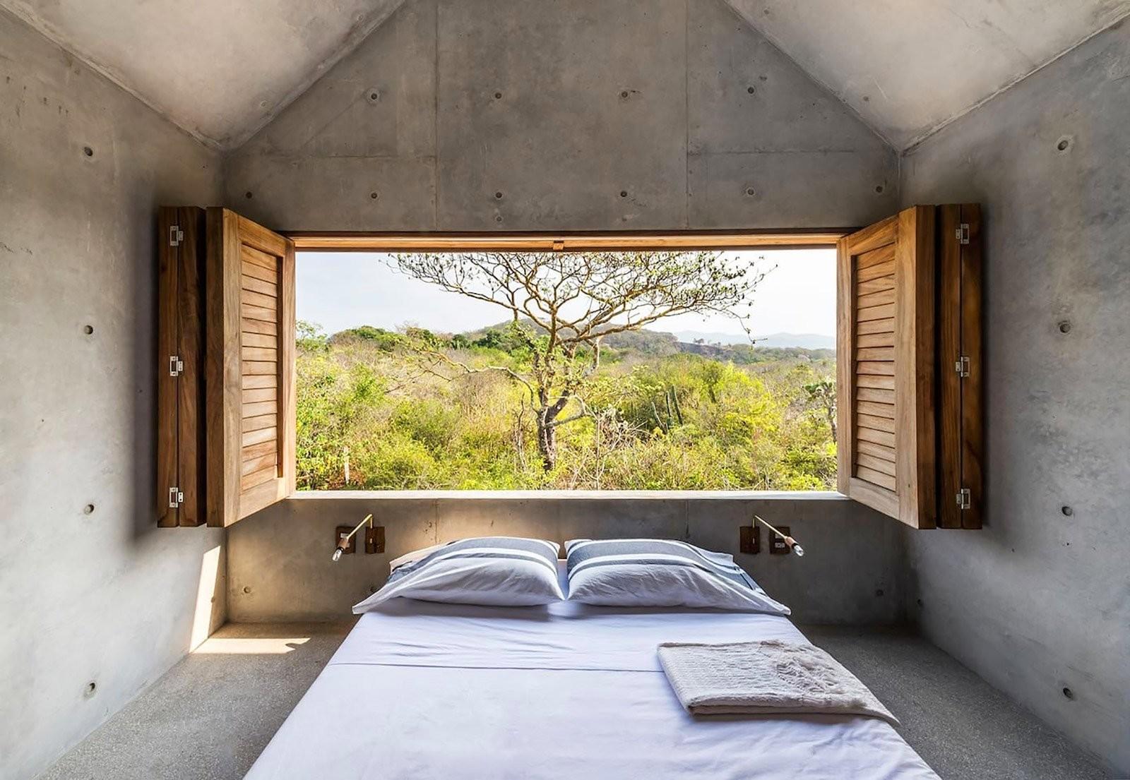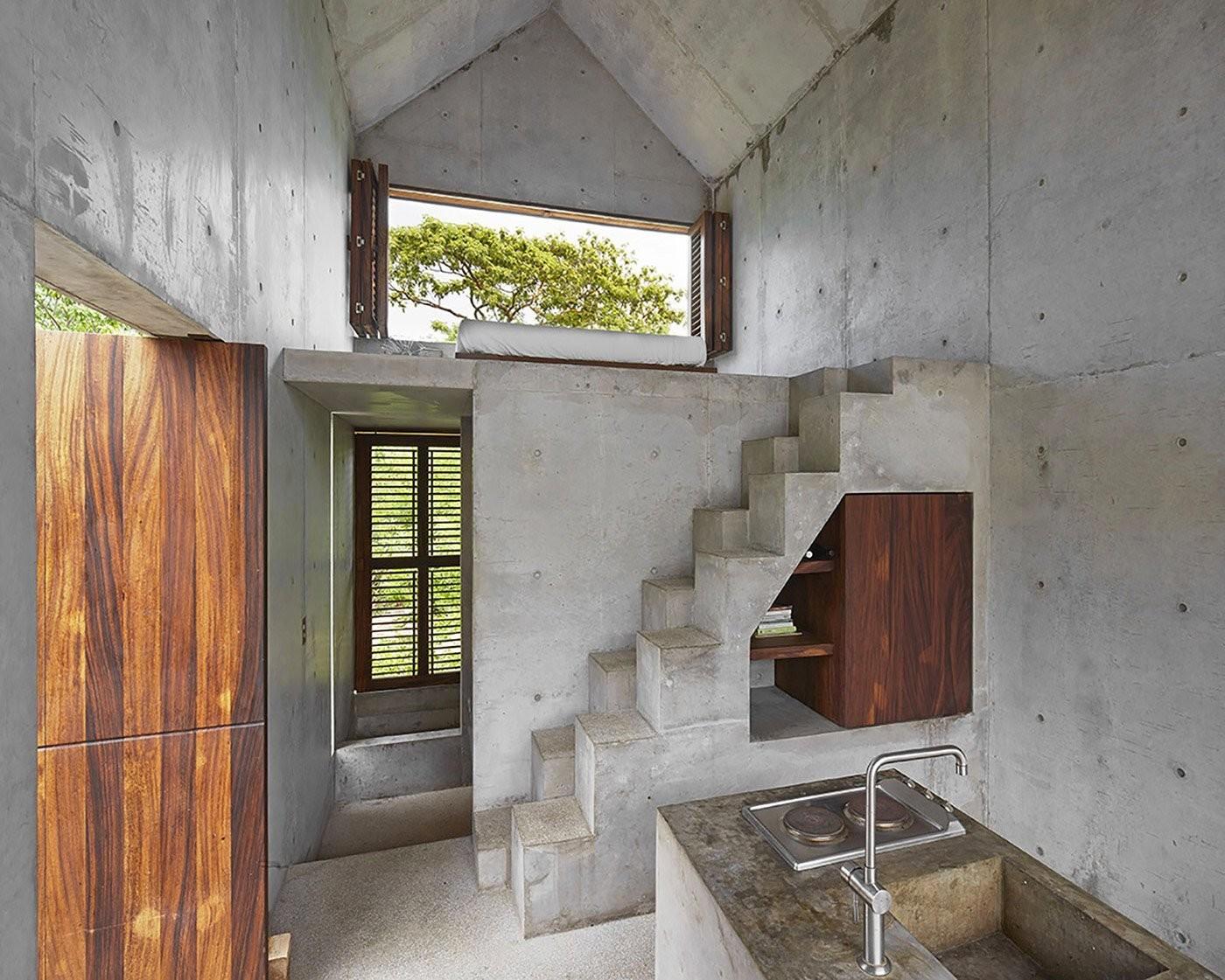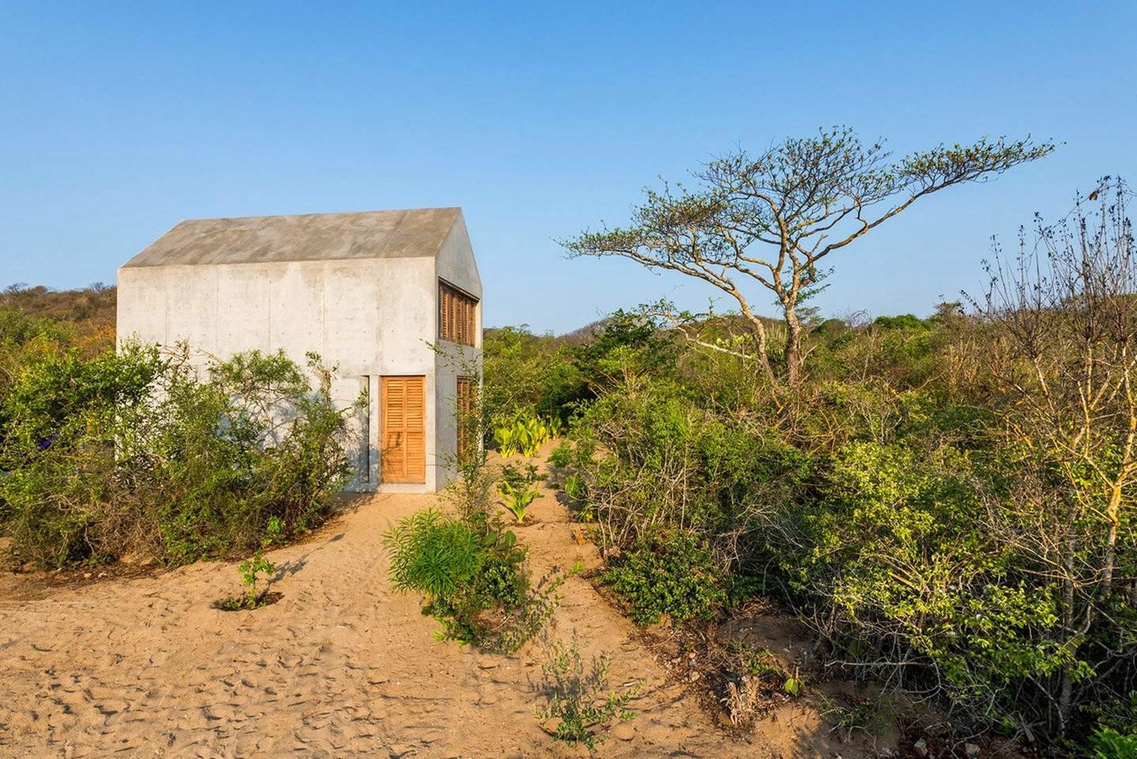 Минималистская конструкция выполнена из бетона и дополнена деревянными акцентами, которые придают интерьеру ощущение деревенского тепла. Окружённый зеленью и песком, спокойный, удобный и простой — дом является идеальным выбором для тихого отдыха на лоне природы.