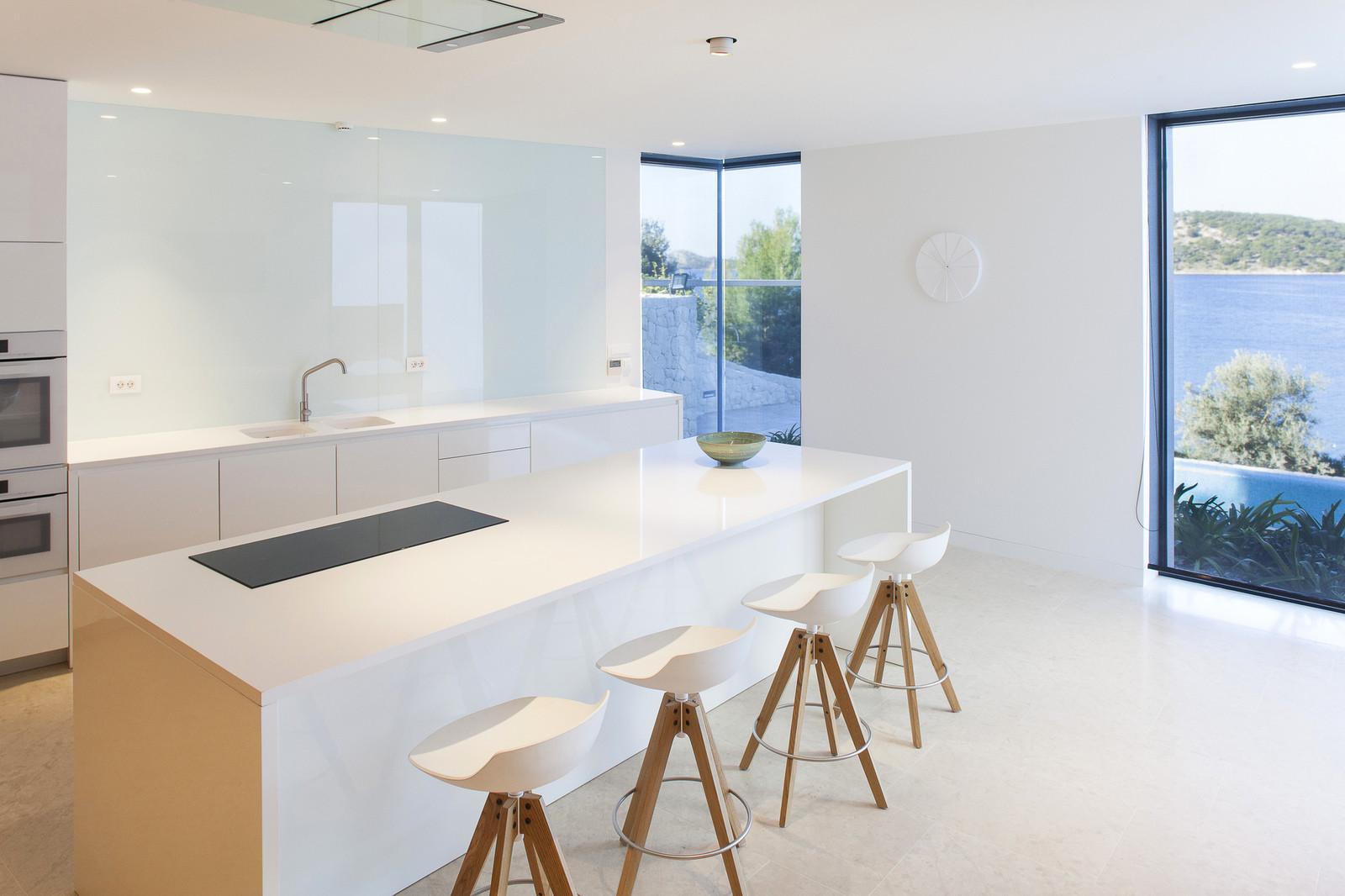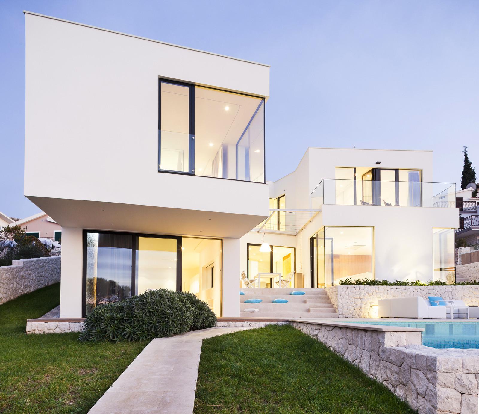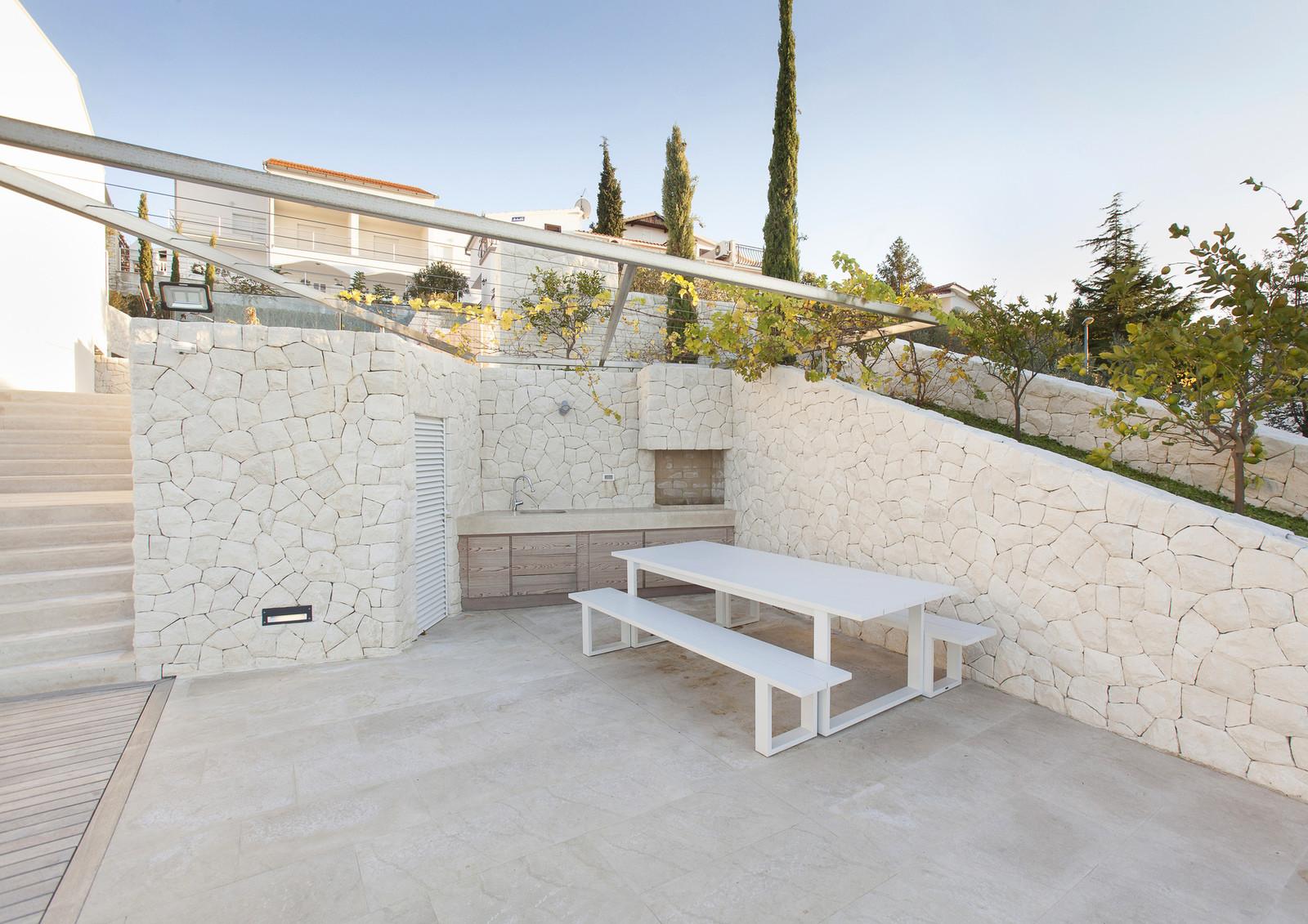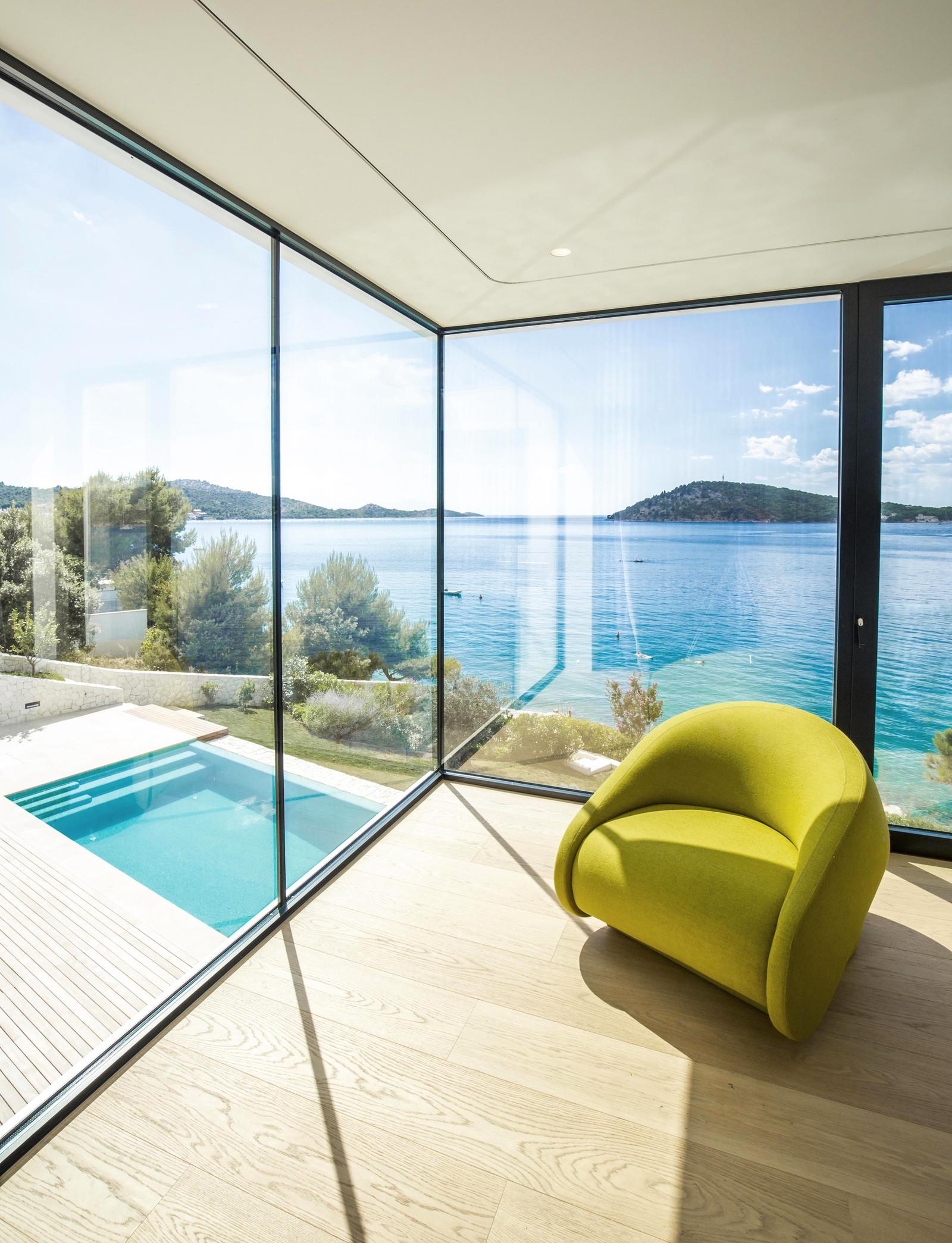 Резиденция имеет U-образную форму, повёрнута к морю и открывает потрясающие виды. Она представлена двумя этажами, которые разбиты на несколько уровней. На террасе с открытой кухней спроектирован бассейн, выступающий в роли связующего элемента между интерьером и бескрайними просторами голубых вод. Все комнаты, выходящие на эту сторону, имеют панорамное остекление, в то время как другие фасады выполнены более закрытыми.
