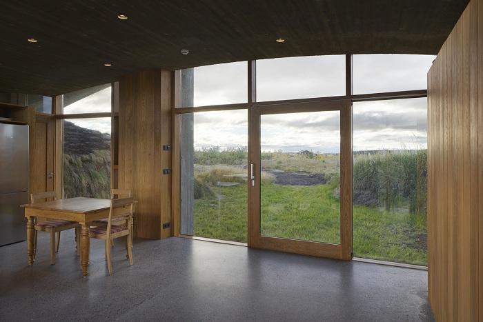 Внутри жилища площадью 68,4 квадратных метров расположены спальня, ванная комната, прихожая и кухня. С двух противоположных сторон вместо стен установлены огромные стеклопакеты от пола до потолка. Таким образом, хозяевам открывается отличный вид на бескрайний суровый ландшафт.
