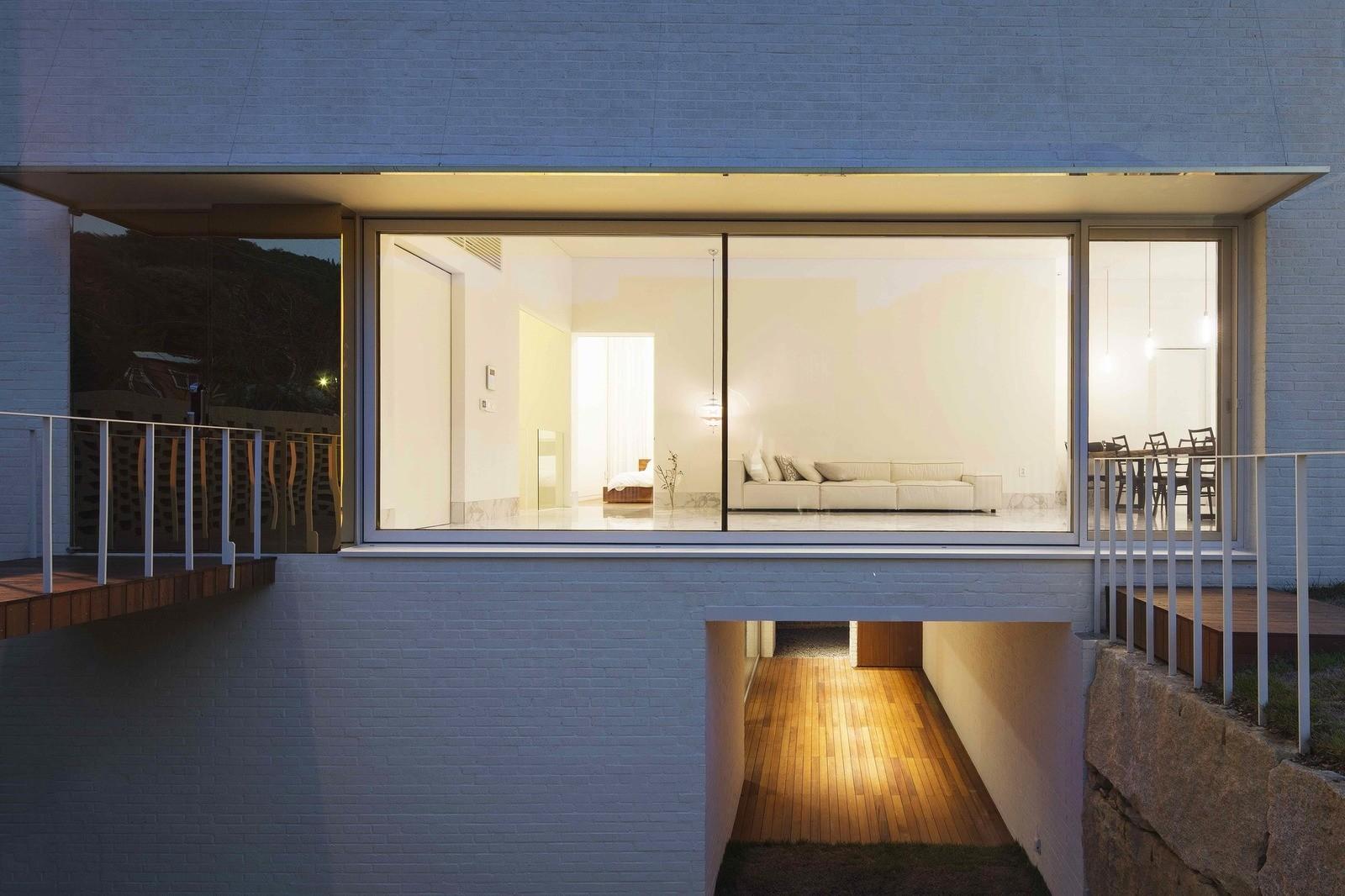 Особняк площадью 311 квадратных метров поделён на две части, соединённые открытым участком с газонами. Две гостиные зоны спроектированы одна напротив другой, в то время как спальни вынесены в противоположные части двух домов.