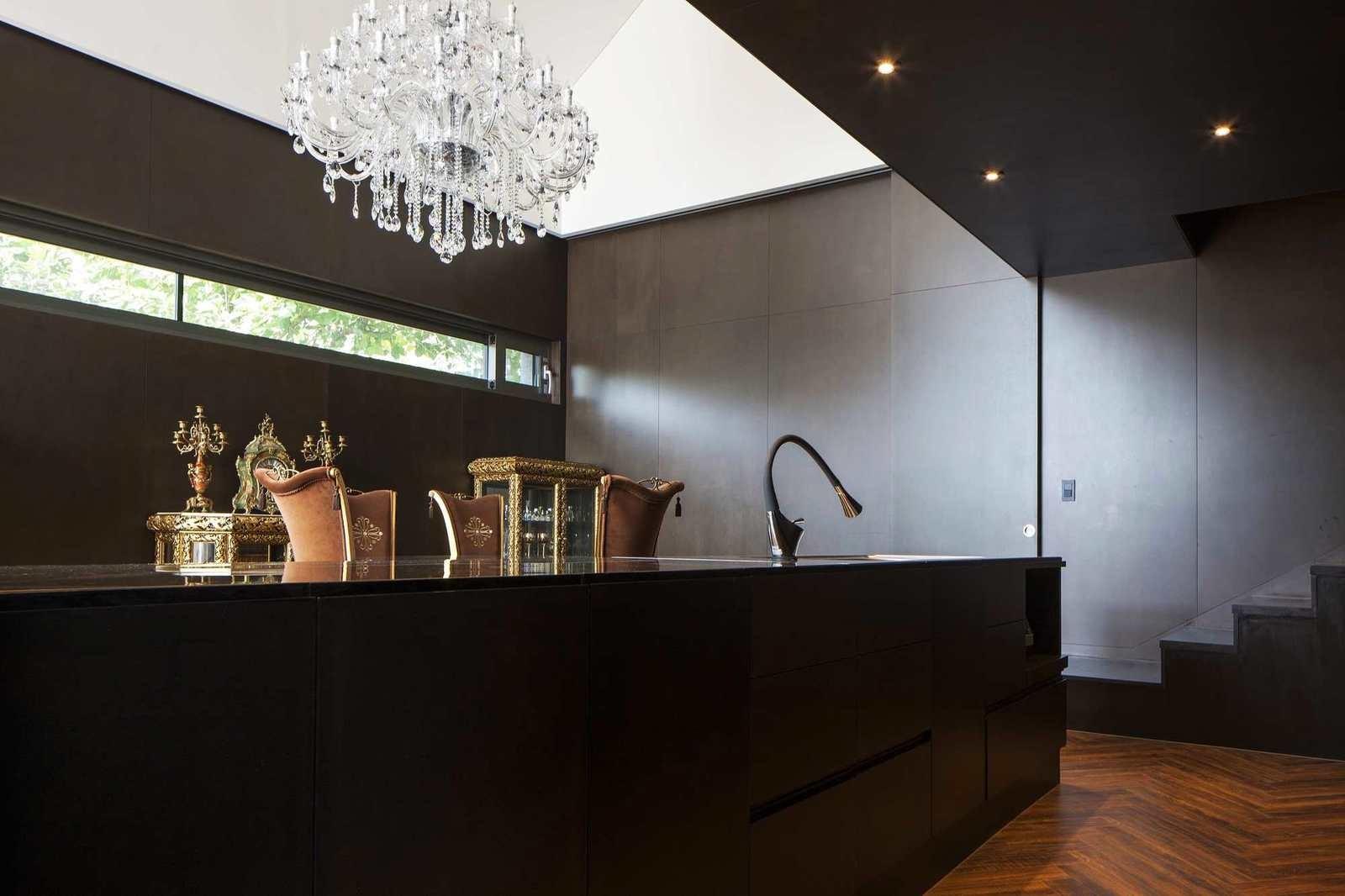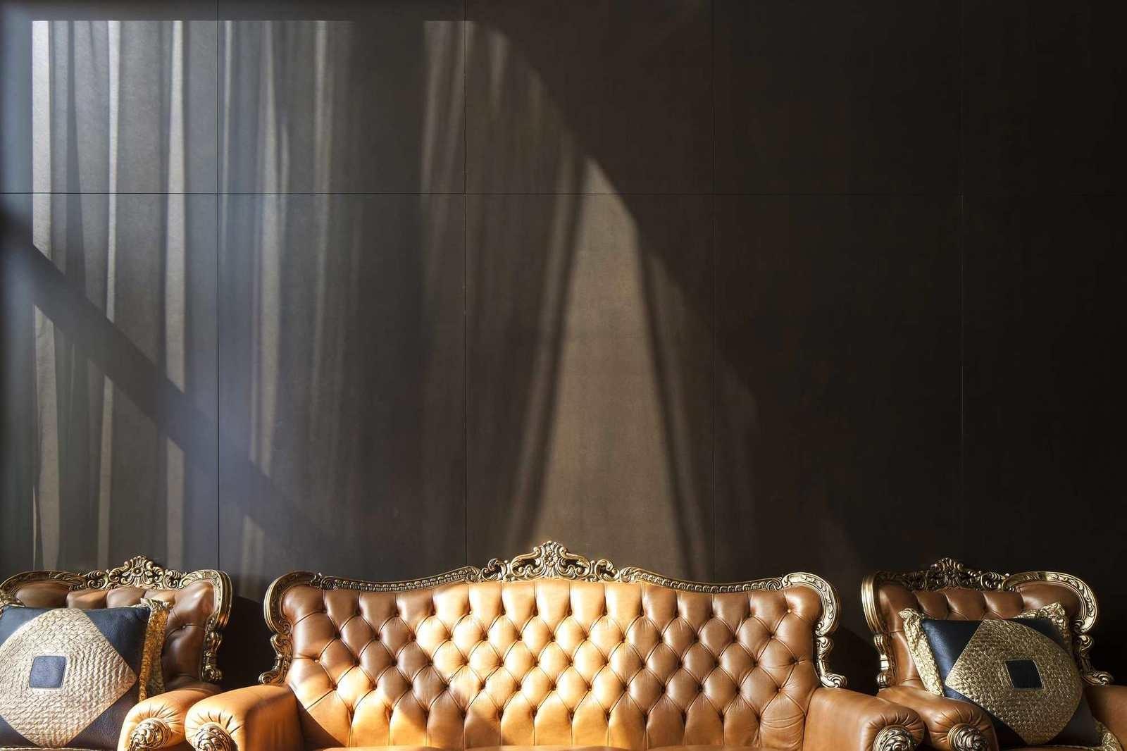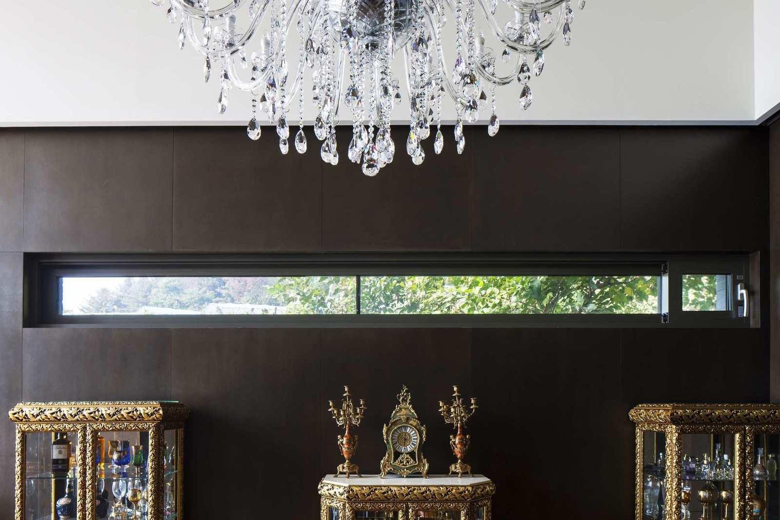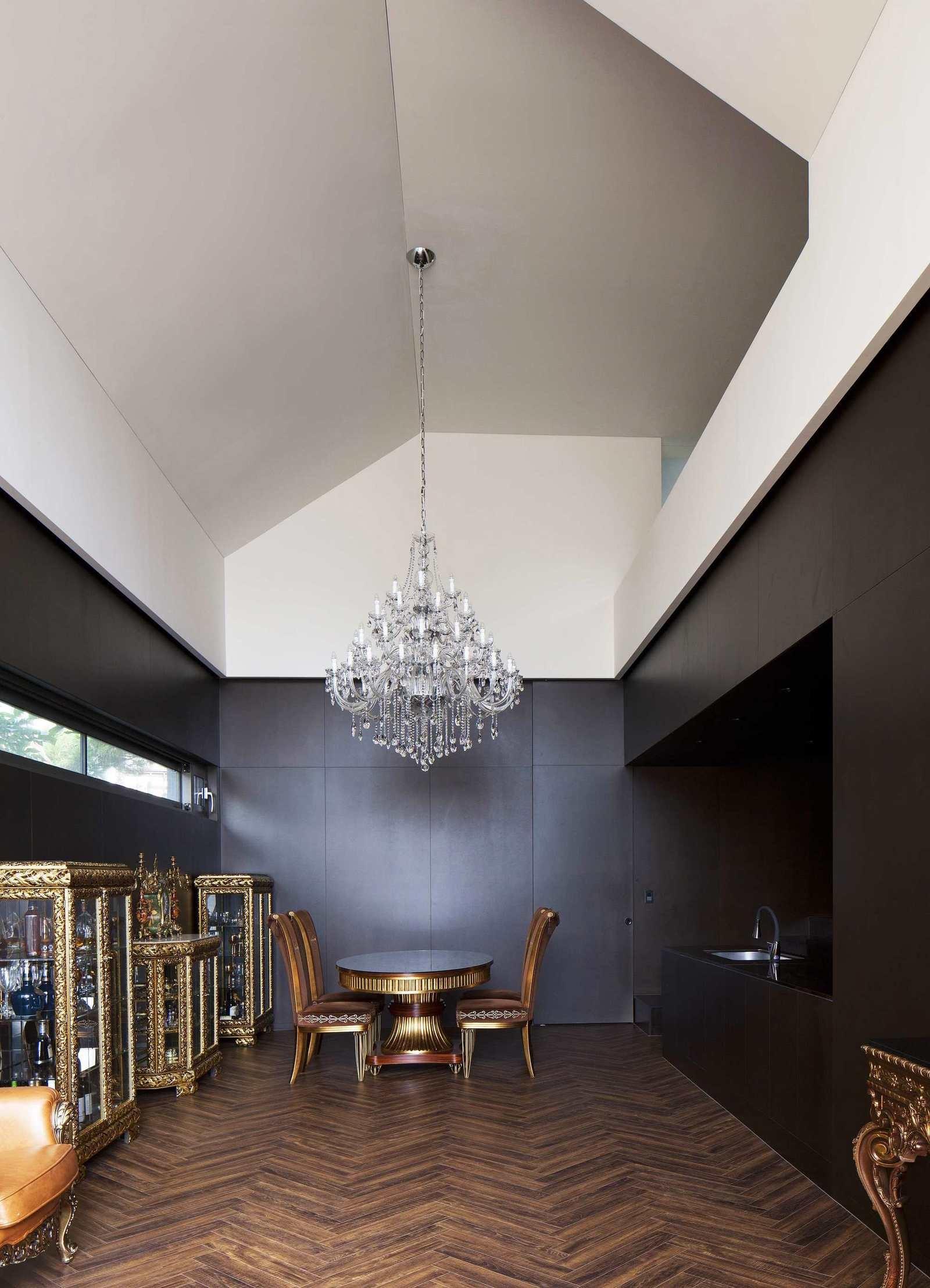 В доме для родителей заказчик хотел поставить всю их винтажную мебель, поэтому интерьер должен был соответствовать. Элегантные и грандиозные предметы требовали открытого пространства. Высота потолка в 6 метров позволила оформить гостиную зону в тёмном цвете.