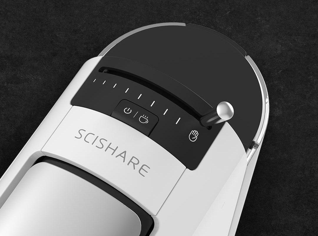 Для простоты управления применяются несколько клавиш и светодиодных указателей. Кофеварка легко чистится и, по заявлению производителя, не имеет аналогов в эксплуатации. В комплекте поставки Scishare идут восемь профилей для чашек различного объема – от 15 до 85 мл. Изделие достаточно компактное, его размеры – 34 х 26 х 10 см.