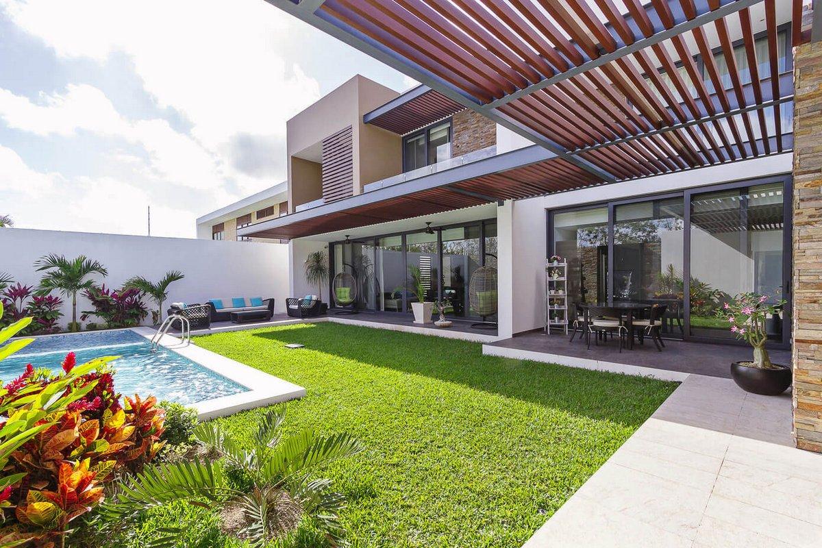 Специальный навес на внутренней части дома создает теневую зону, в которой расположены обеденный стол и зона отдыха. На противоположном конце участка расположена небольшая сауна, которую довольно редко встретишь в жаркой Мексике.