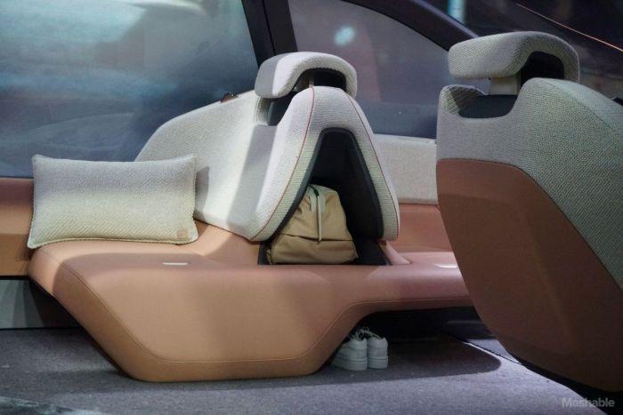 Интерьер напоминает салон самолета первого класса, здесь есть раскладной столик и множество отсеков для хранения различных вещей. Бортовой помощник NOMI управляет автомобилем, следит состоянием водителя и проецирует на лобовое стекло любую информацию.