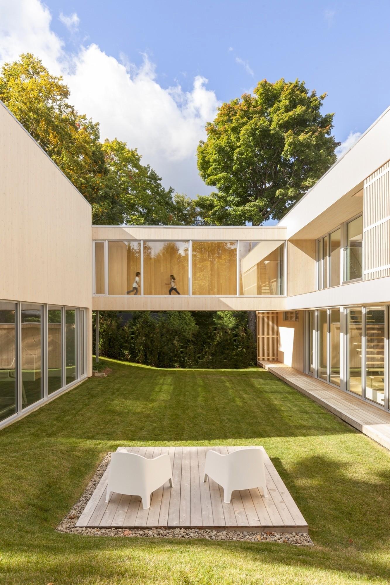 Два объёма из дерева, утопленных в пологий склон, образуют яркий зелёный внутренний двор, ограниченный с внешней стороны лесом. Оба крыла связаны между собой крытым остеклённым переходом, который пронизывает жилые пространства дома и задаёт направление к озеру.