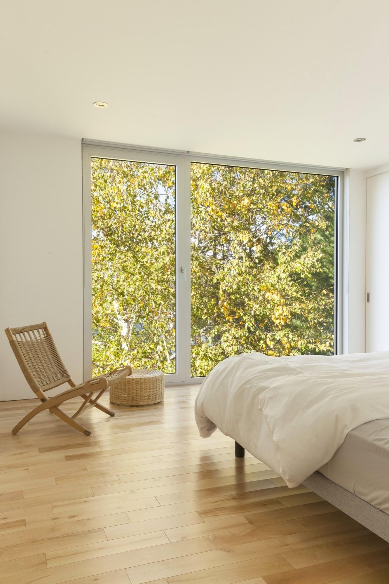 Огромные панорамные окна и светлое дерево создают воздушное, пронизанное солнцем пространство дома, из каждого уголка которого открывается вид на живописное лесное озеро.