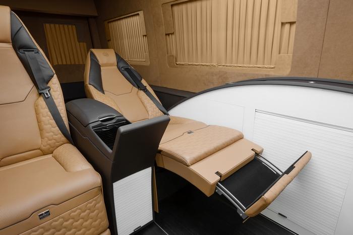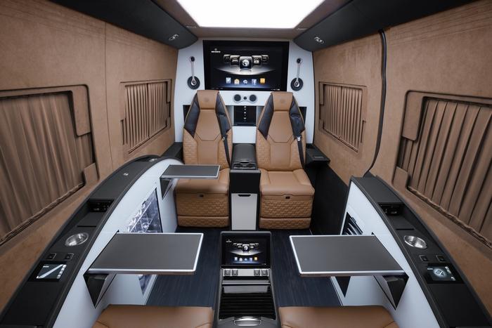 Mercedes-Benz V-Class от Brabus получил третий ряд ультрароскошных сидений, которые побалуют пассажиров подогревом, регулировками на электроприводе, вентиляцией и расслабляющим массажем. Второй ряд кресел откидной, его можно сложить и освободить больше свободного места для ног.