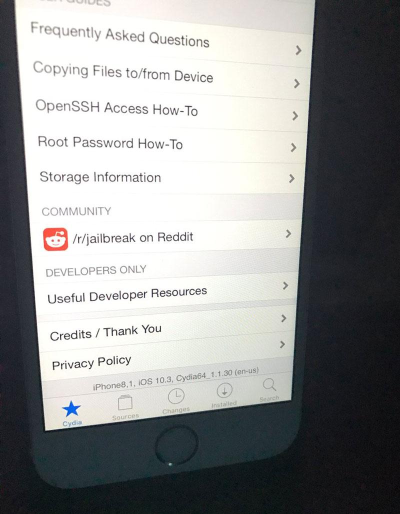 Взломщик опубликовал скриншот со смартфона iPhone 6s, который доказывает, что на устройстве с iOS 10.3 удалось запустить магазин Cydia версии 1.1.30.