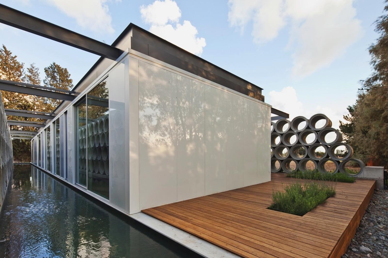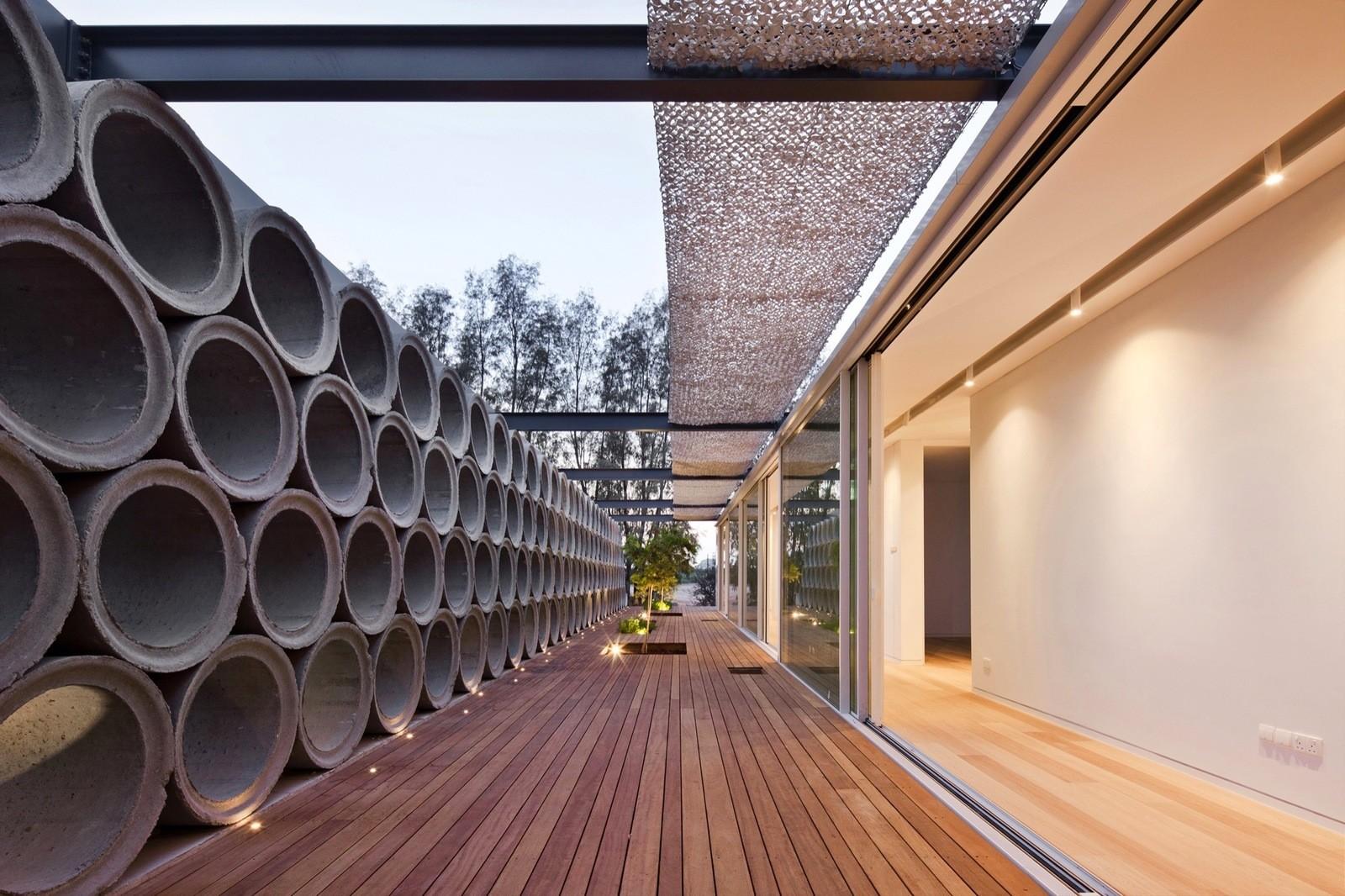 Структура из бетонных труб подчёркнуто тяжёлая и приземлённая, в ней не использованы высокие технологии. Она обеспечивает дополнительную защиту от окружающей среды, прежде всего — от солнца, но также и от посторонних взглядов.