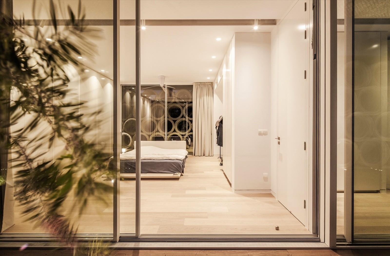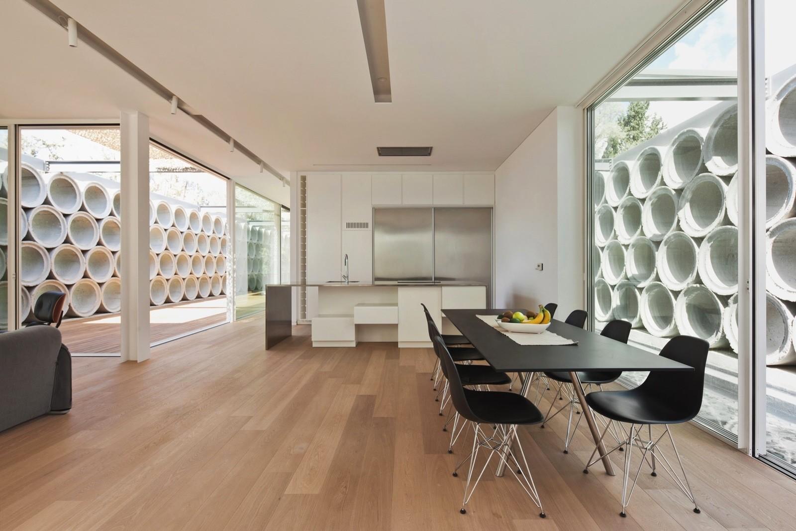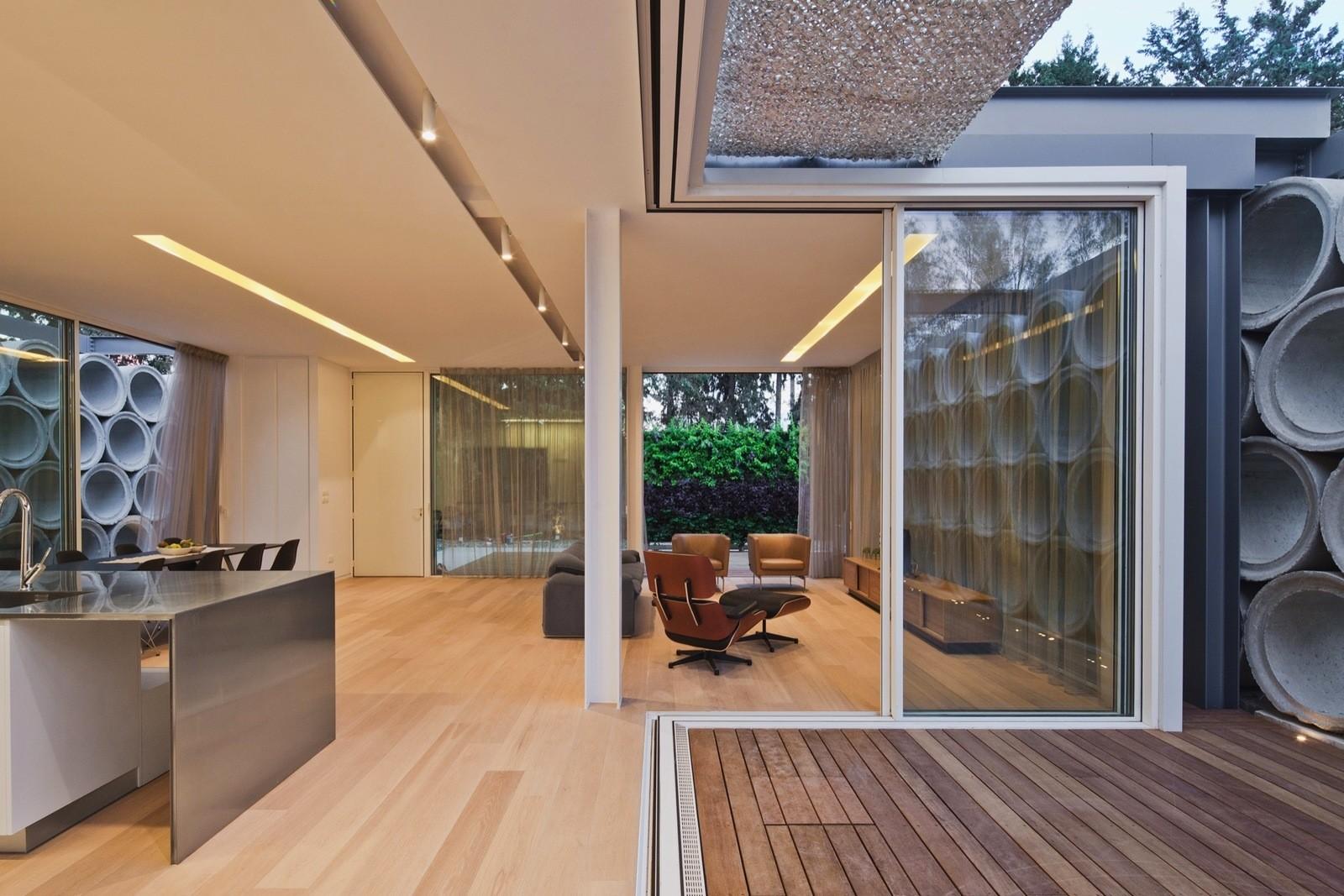 Первая оболочка включает несущую конструкцию из металлических балок и опор, установленную на постаменте из бетонной плиты. Крыша выполнена из гофрированного металлического листа, наружные стены сделаны как зафиксированные и раздвижные секции двойного остекления в алюминиевых рамах. Стеклянная оболочка заключает в себе интерьер дома. Чистый, минималистичный и технологически продвинутый, он создаёт контраст с объёмно-геометрическим узором второй оболочки.