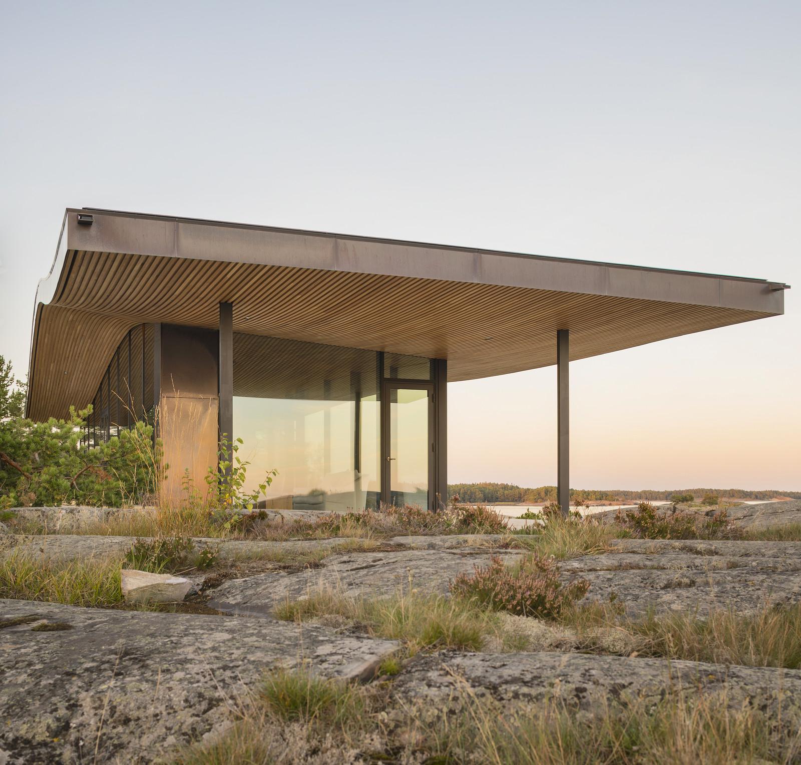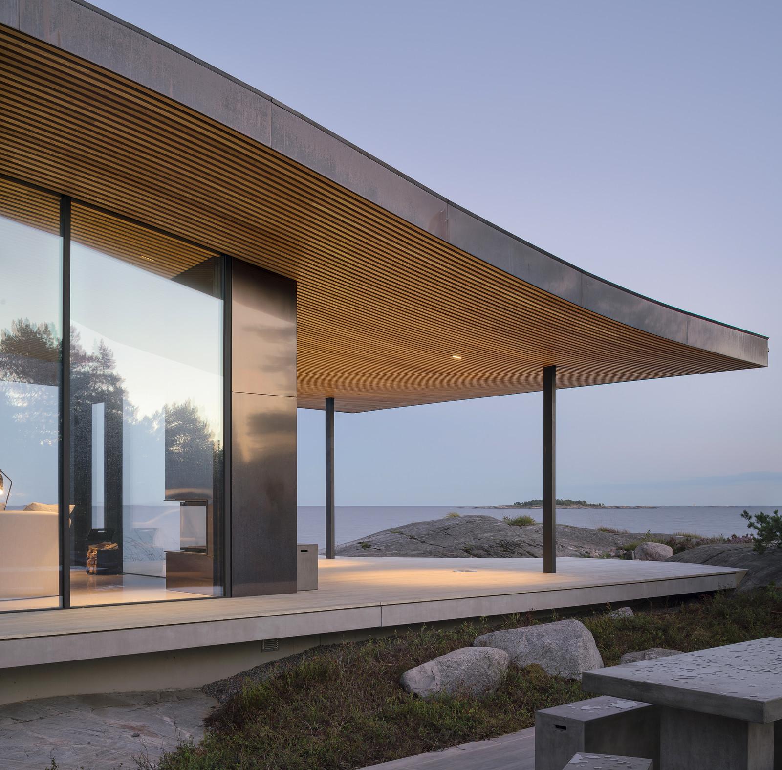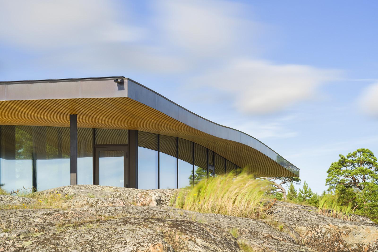 Постройка площадью всего 90 квадратных метров уютно расположилась на холме между сосновым лесом и морем в северной части Финляндии. В процессе строительства павильона архитекторы сохранили практически всю растительность на участке. Резиденция вытянулась параллельно береговой линии, защищая от ветров. Выступающие карнизы объединяют внутренний мир дома с окружающей природой, одновременно создавая тень и оберегая от дождя. Форма крыши повторяет рельеф местности.