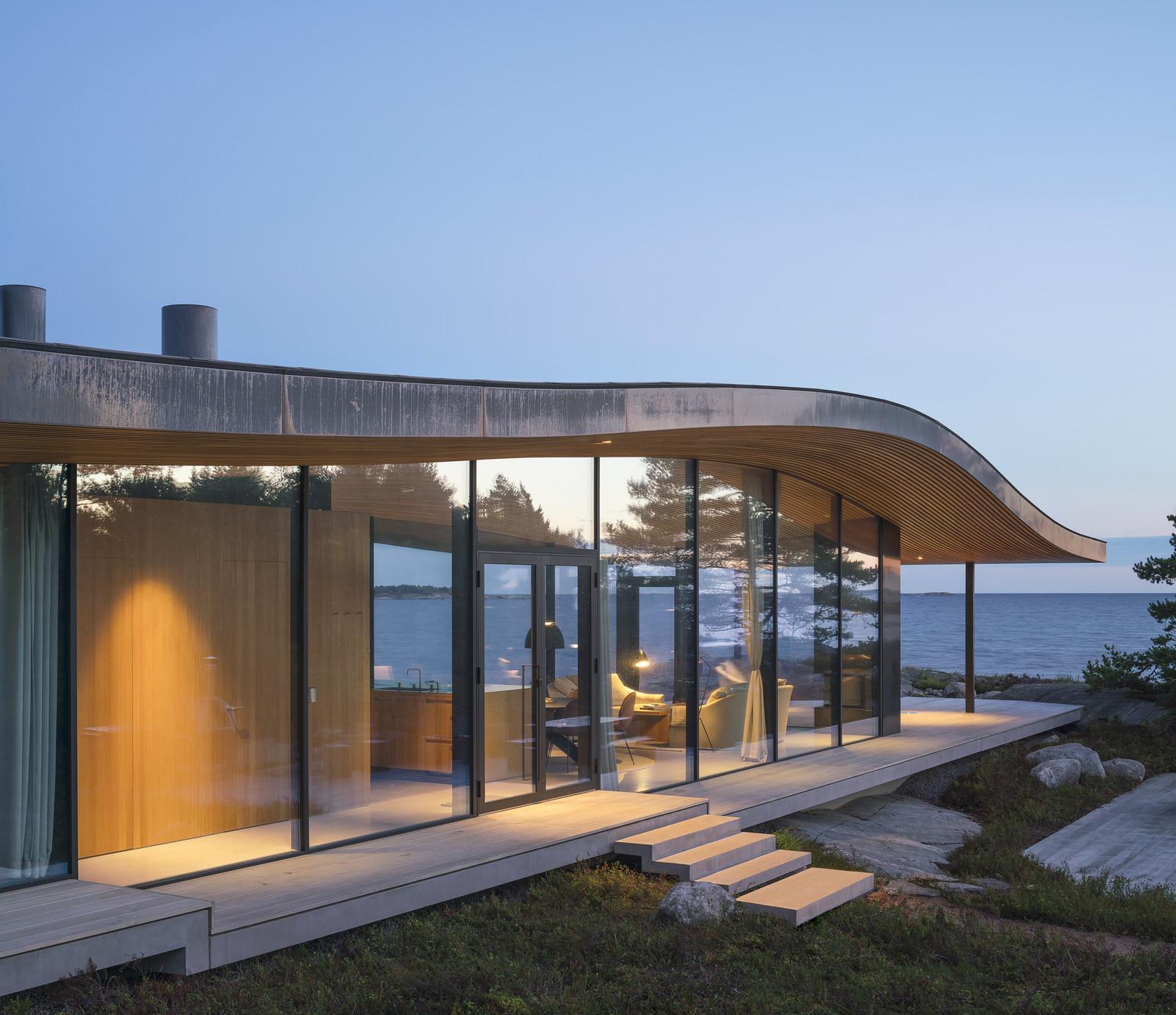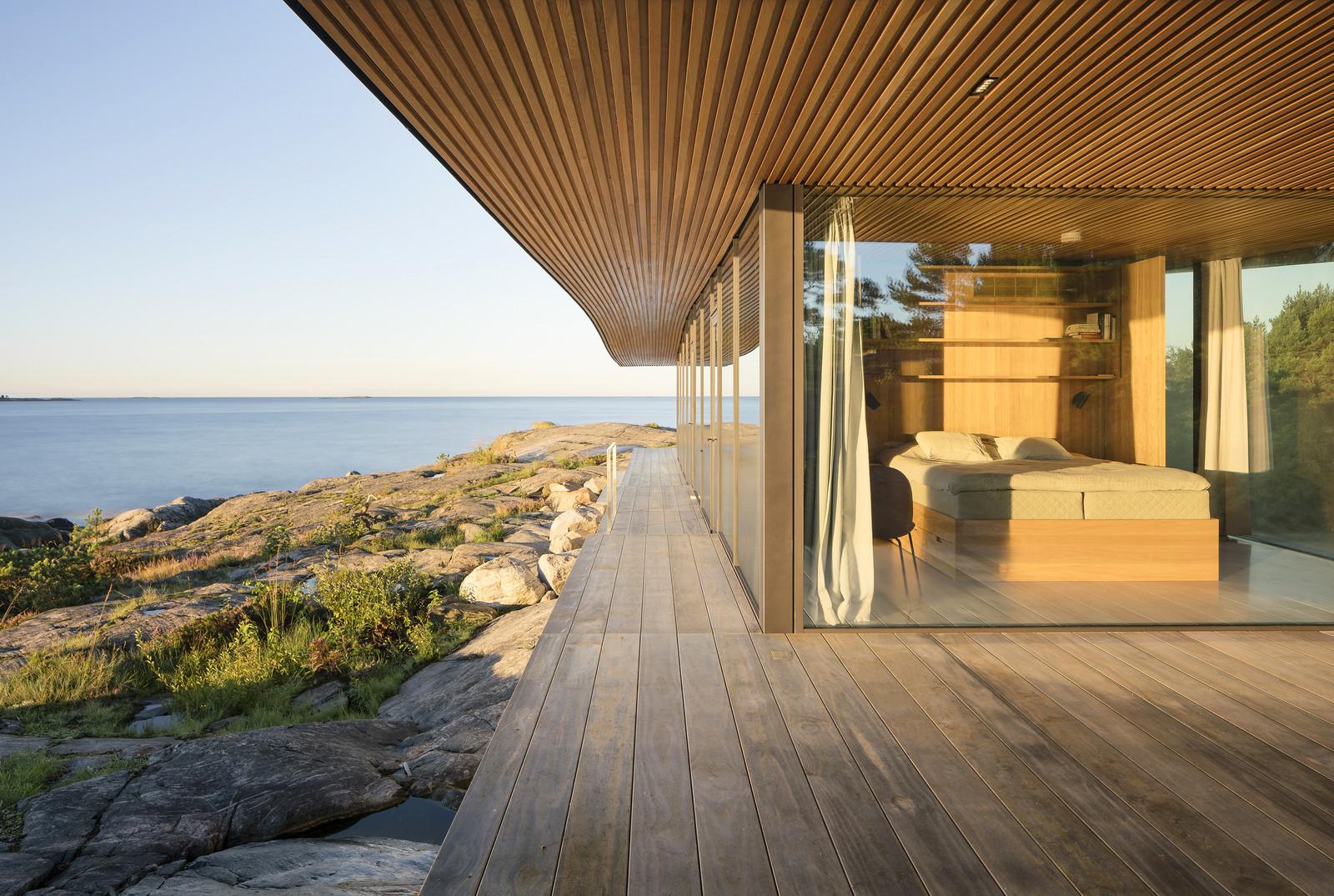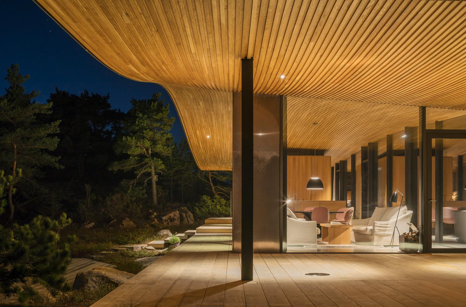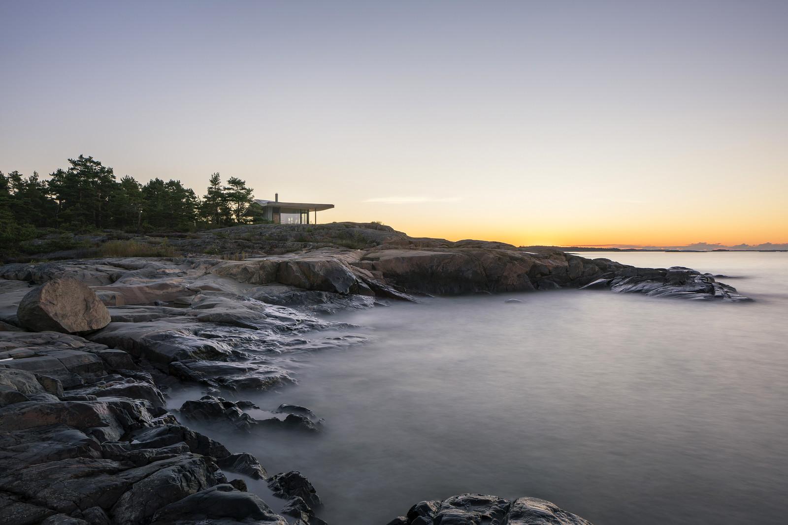 Постройка площадью всего 90 квадратных метров уютно расположилась на холме между сосновым лесом и морем в северной части Финляндии. В процессе строительства павильона архитекторы сохранили практически всю растительность на участке. Резиденция вытянулась параллельно береговой линии, защищая от ветров. Выступающие карнизы объединяют внутренний мир дома с окружающей природой, одновременно создавая тень и оберегая от дождя. Форма крыши повторяет рельеф местности.