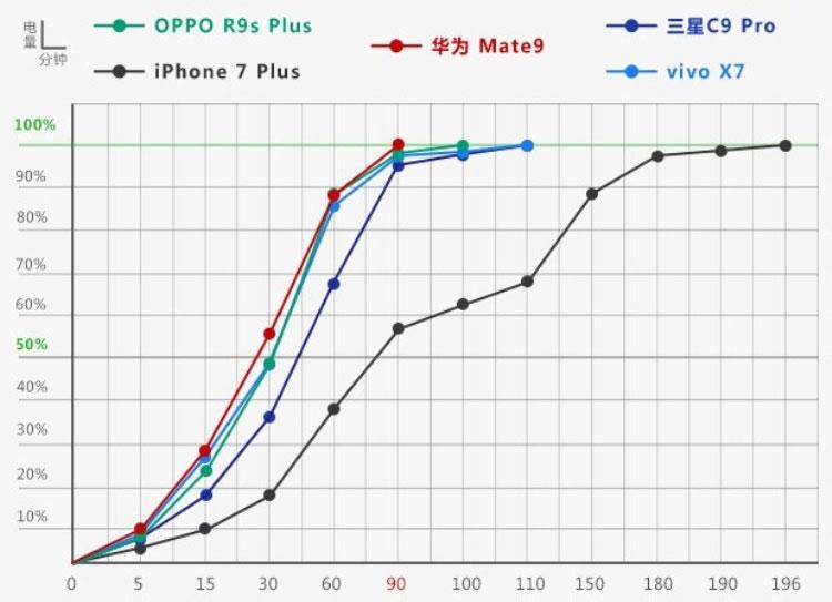 Действительно ли 18 (или даже 20) минут до полной зарядки аккумулятора емкостью 3000 мАч является выдающимся результатом, как это преподносится Meizu? Ответ на вопрос можно получить, сравнив Super mCharge с альтернативами от Huawei, OPPO и Qualcomm. В рамках эксперимента ресурс Gizmochina отобрал смартфоны Huawei Mate 9, Samsung Galaxy C9 Pro, Vivo X9 и OPPO R9 Plus. В их спецификациях указана поддержка технологии быстрой зарядки Huawei Super Charge, OPPO VOOC, Qualcomm Quick Charge 3.0, а также наличие идентичной по ёмкости батареи на 4000 мА·ч. Также в эксперименте участвовал iPhone 7 Plus с аккумулятором 2910 мА·ч, в котором не используются технологии, ускоряющие процесс зарядки.