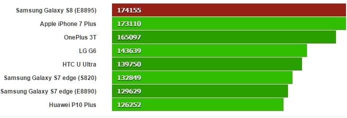 В бенчмарке AnTuTu вариант Galaxy S8 с процессором Exynos 8895 набрал 174 155 баллов, опередив бессменного лидера рейтинга iPhone 7 Plus. Однако версия флагмана Samsung на базе Snapdragon 835 показала куда более скромный результат в 162 101, что существенно ниже результата «яблочного» флагмана в 173 110 баллов.