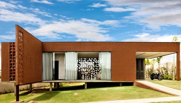 Основой дома выступает стальной каркас. Частично фасад закрыт бетонной решеткой с традиционным бразильским орнаментом Cobogó. Пустотелый блок с характерным рисунком был придуман в 1920-е годы. Решетка Cobogó позволяет защищать жилище от палящих солнечных лучей и обеспечивает конфиденциальность хозяевам.