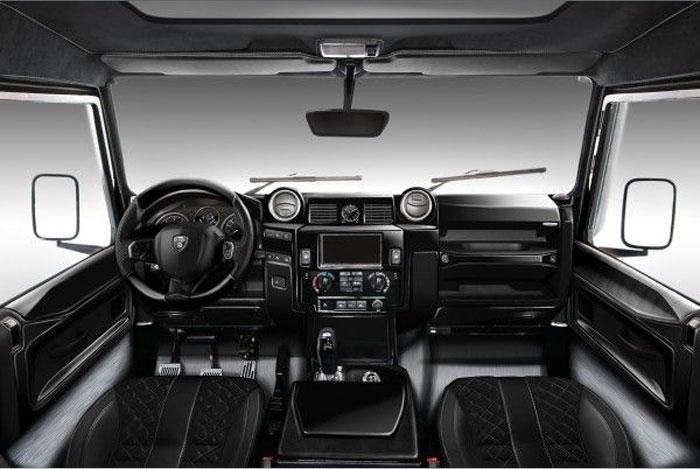 Внешний вид внедорожника получился по-настоящему агрессивным: расширены колёсные арки и колея, установлен шноркель, металлические бампера, новый капот, усиленные пороги и «зубастые» шины, а перед задними колёсами выведены патрубки выпускной системы.
