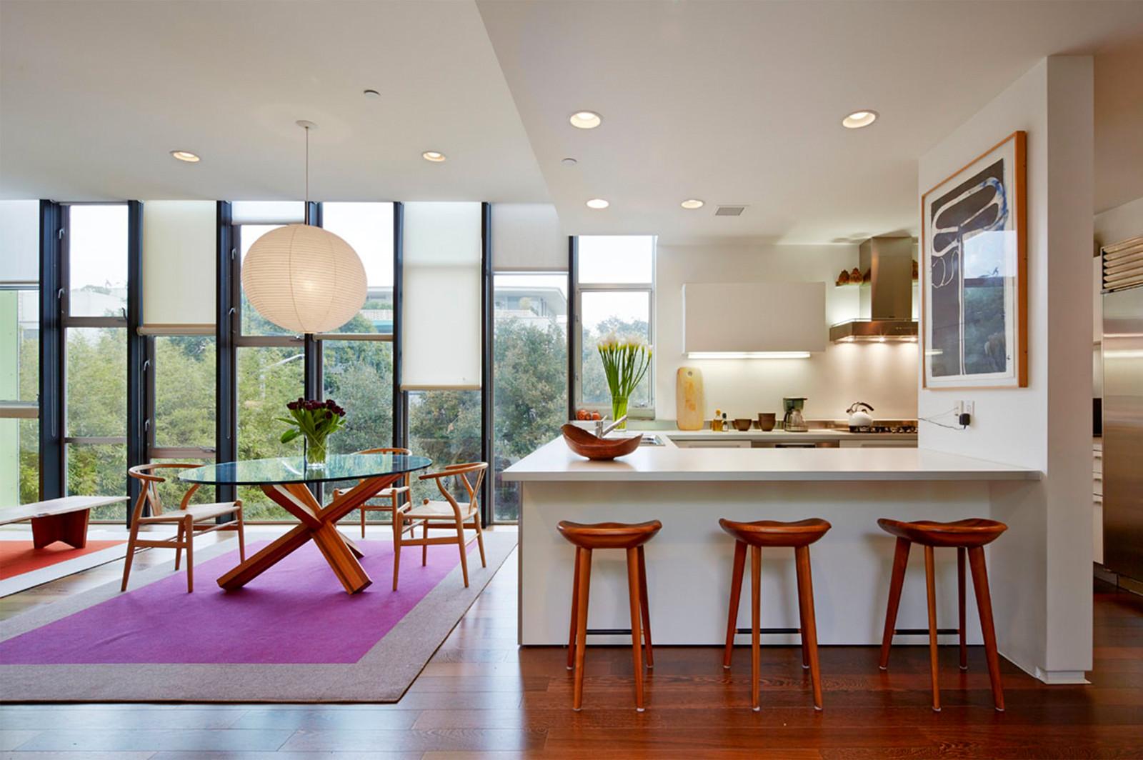 Насыщенные тона обыгрывают глубокий салатовый оттенок фасада и зелёный сад. Атриум в центре дома наполен светом и позволяет распространяться лучам, создавая воздушную и ненавязчивую атмосферу. В гостиной находятся диван, кресло, оттоманка и стол, созданные дизайнером Leslie Shapiro Joyal. Они создают ощущение современного интерьера и подчёркиваются оранжевым, коричневым и жёлтыми цветами гостиной.