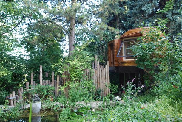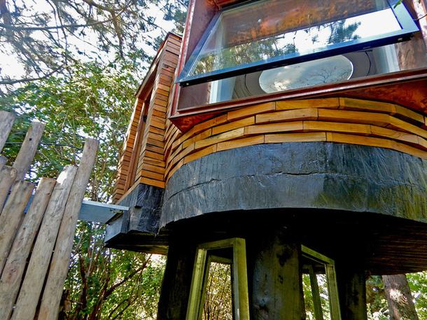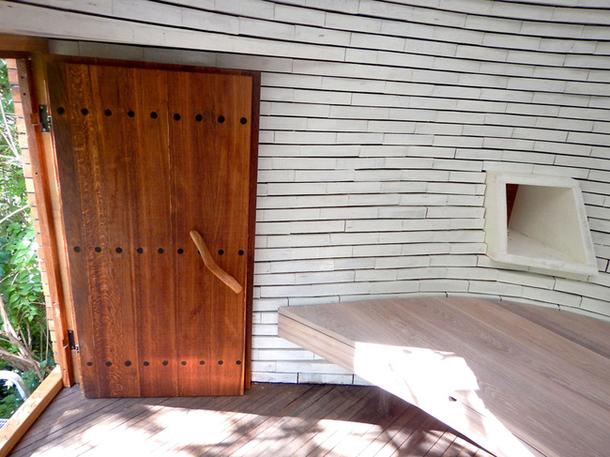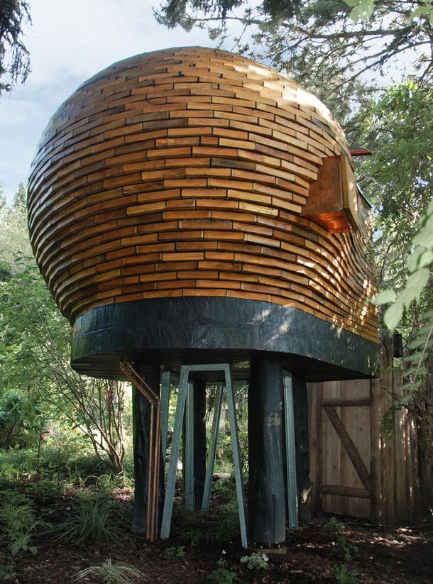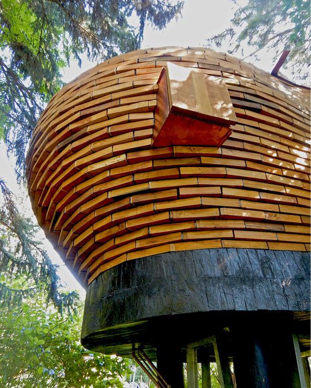 Австрийский чайный домик, отдаленно напоминающий пчелиный улей, поставлен на четыре столба, сделанные из стволов деревьев. Сам домик также выполнен из натуральных материалов и «посажен» на темную основу, которая придает этой миниатюрной конструкции ощущение стабильности и долговечности.