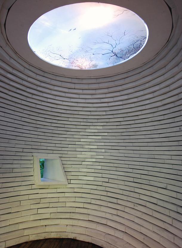 Узкий вход ведет в уютное помещение, по своему настроению напоминающее убежище, в котором можно скрыться и погрузиться в себя. Внутри чайного домика посетителя встречает «трапеция», обрамляющая большое окно, а над головой – овальный просвет, расписанный заказчицей проекта: ее рисунок был распечатан и наклеен на стекло.