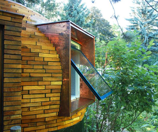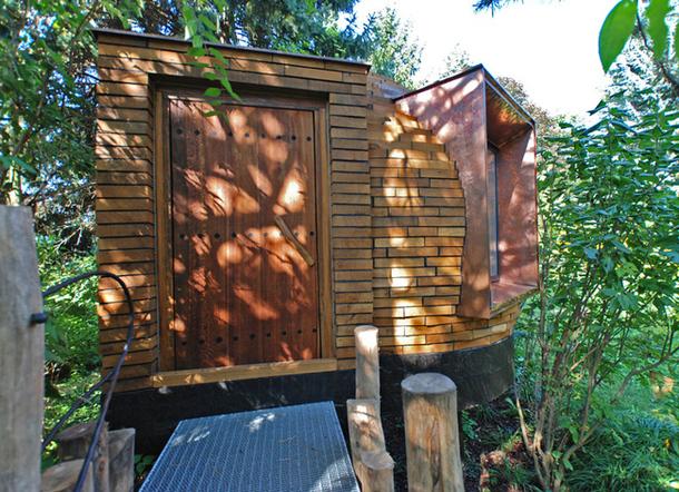 Сочетание дерева дуба и меди помогает чайному домику гармонично встроиться в окружающий ландшафт густого сада.
