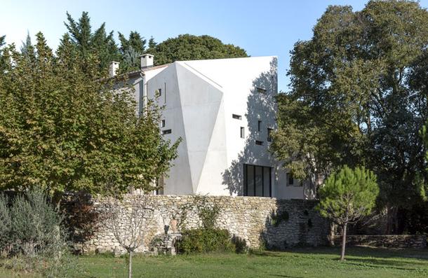 Новая бетонная пристройка поначалу кажется здесь совершенно чужой – она вырастает из зелени и известняка, контрастируя с «духом» этого места – раньше здесь вообще находилась старинная каменоломня. Однако архитекторы продумали конструкцию пристройки до мелочей: бетонный объем сооружен таким образом, чтобы естественная игра света и тени выделяла его граненую форму, а внешний вид утверждал его присутствие и родство с домом, к которому он присоединен.