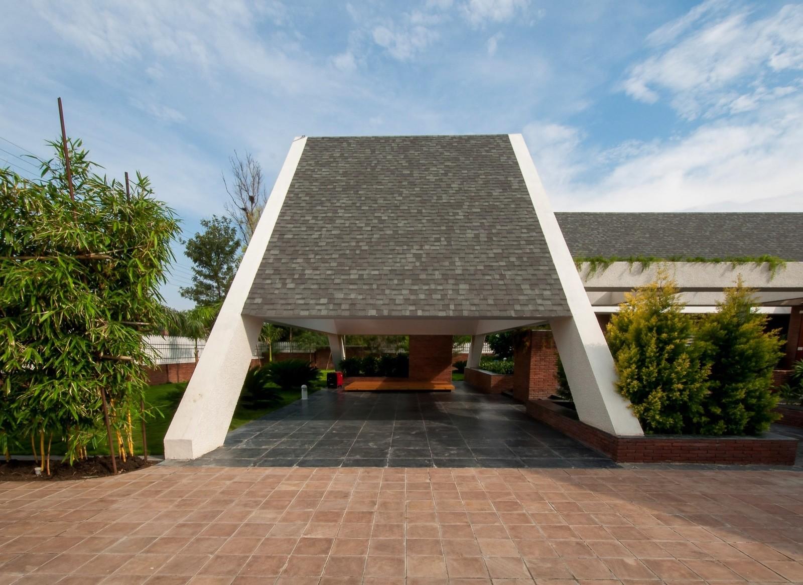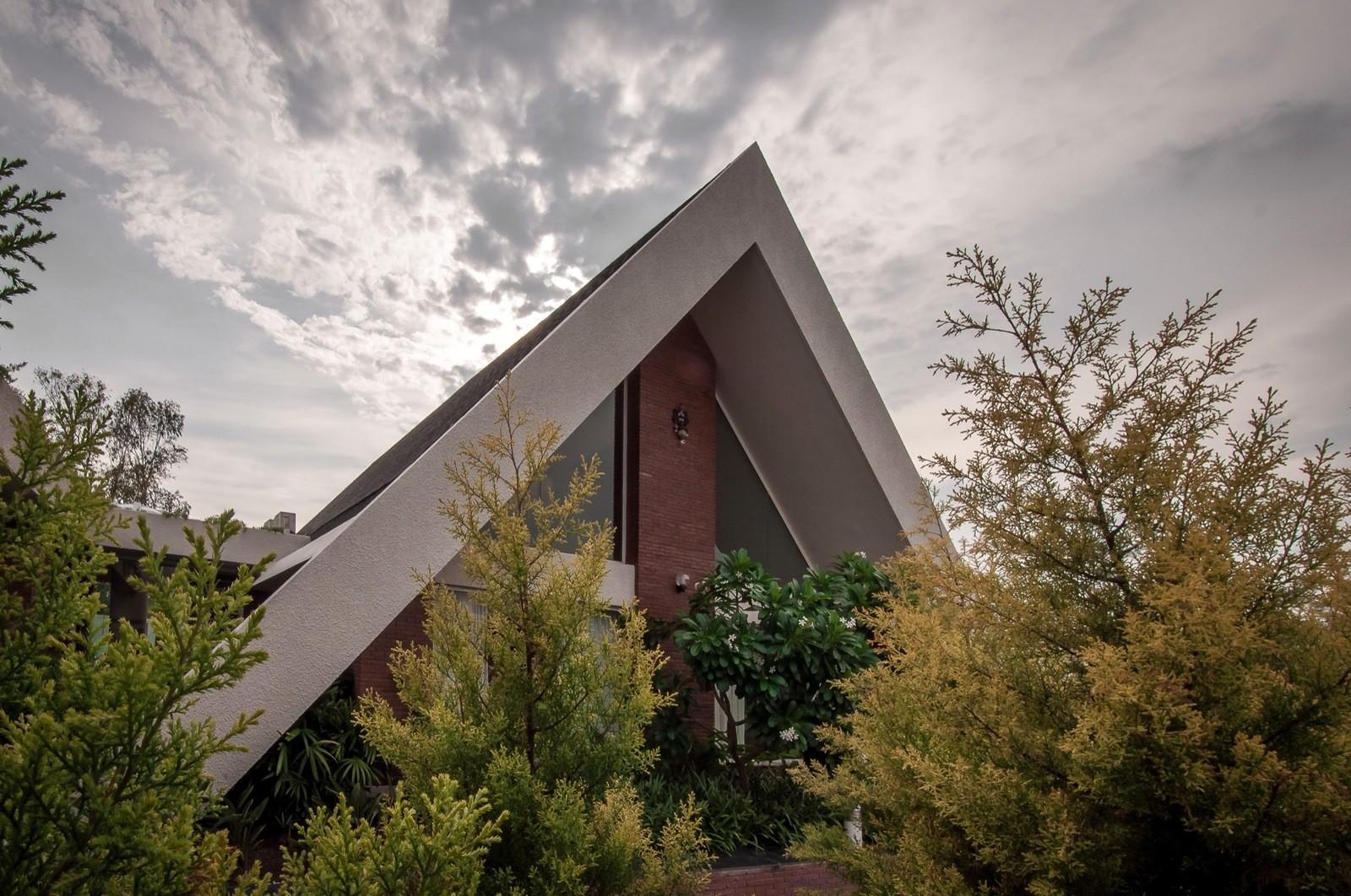 Изящная конструкция с завершениями в виде трёх двускатных крыш отсылает к форме традиционного сельского дома, переосмысленной в современном духе.