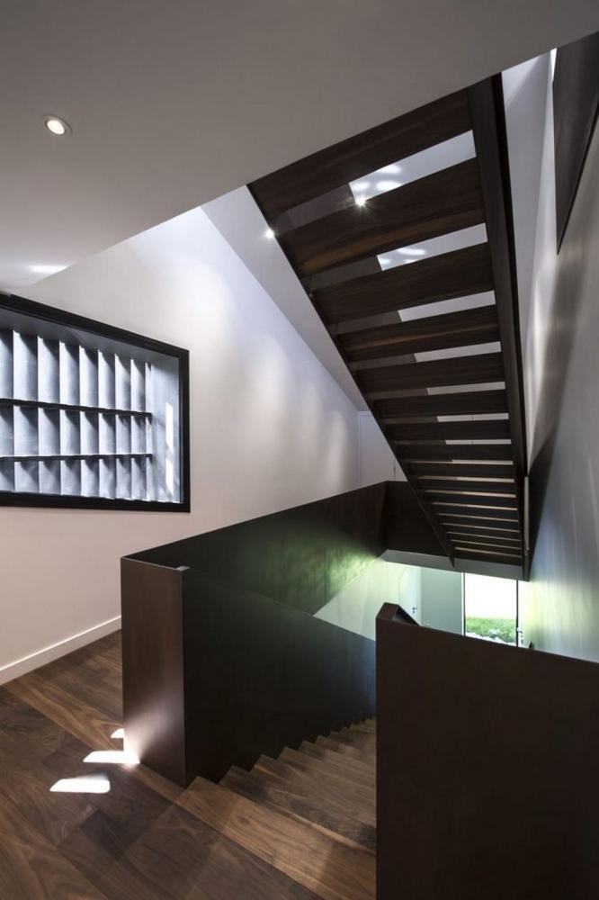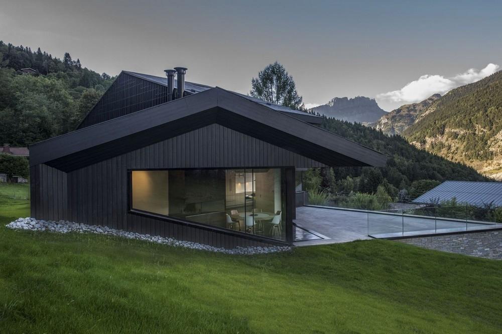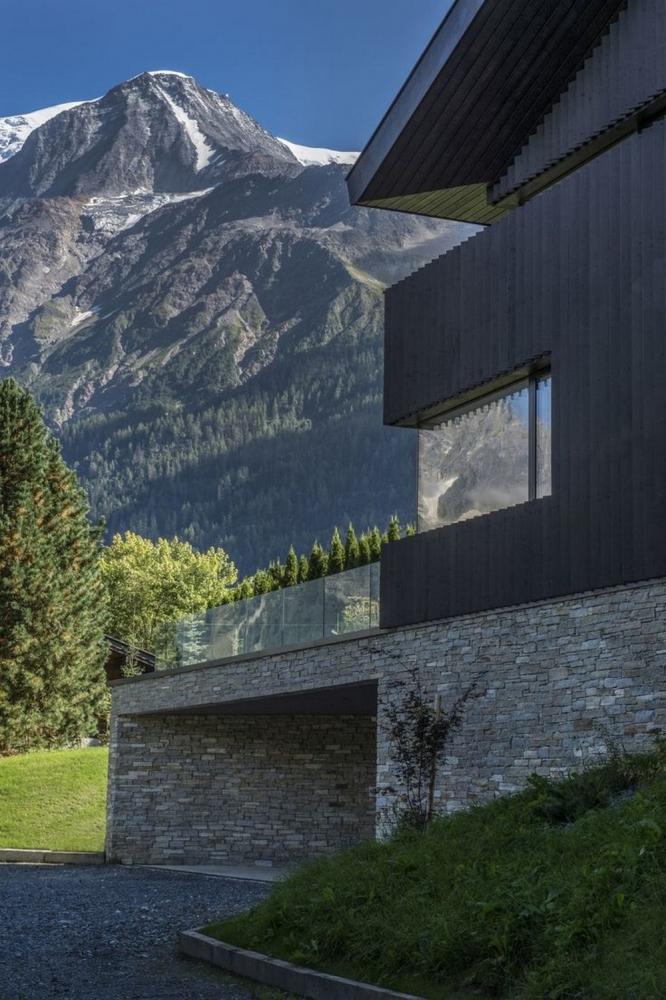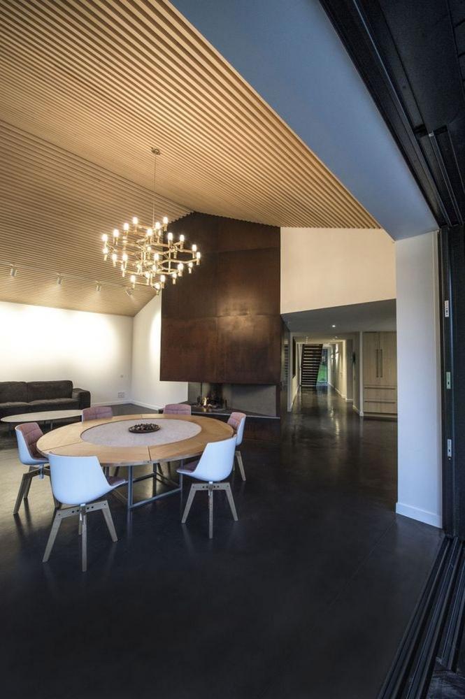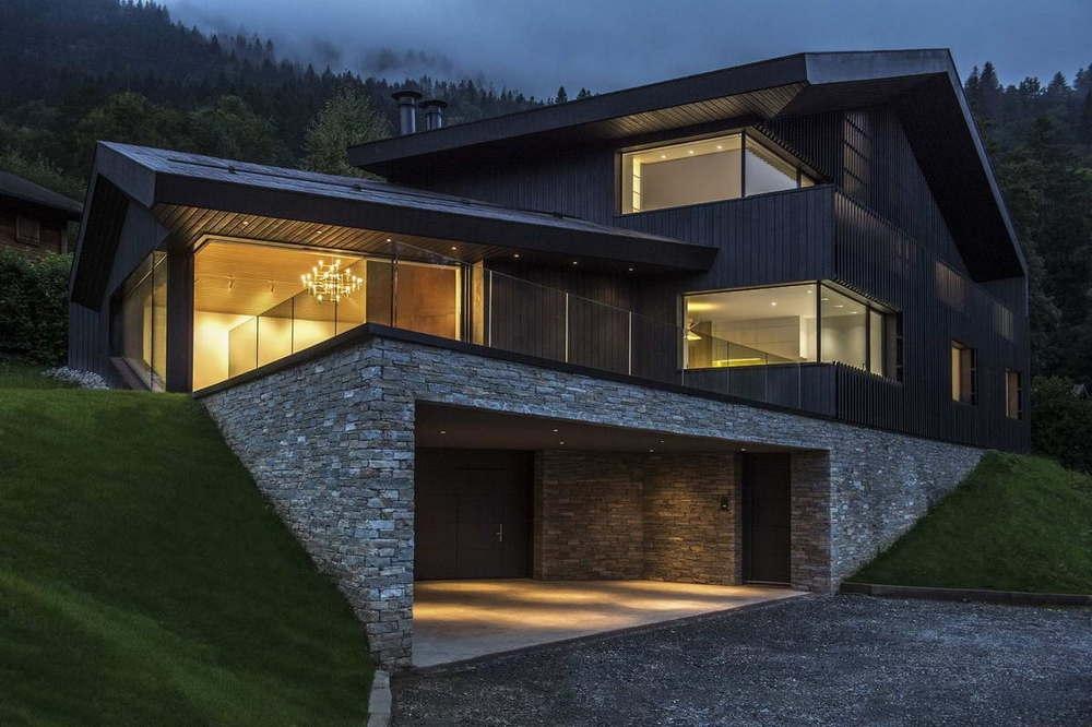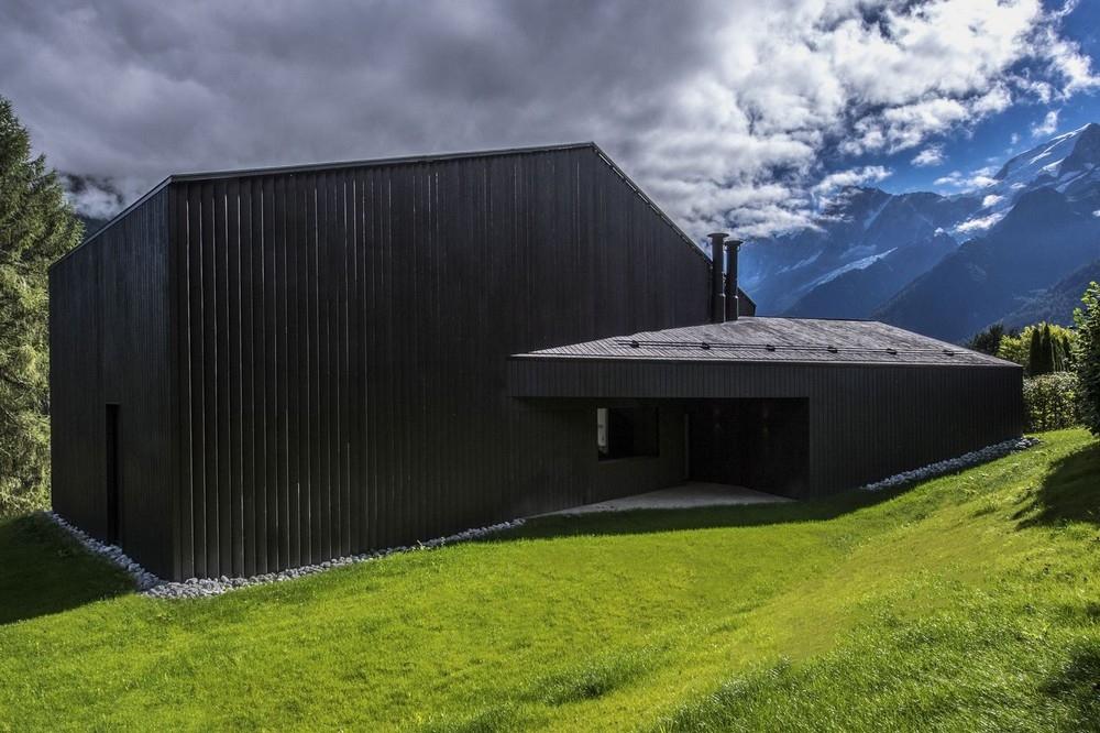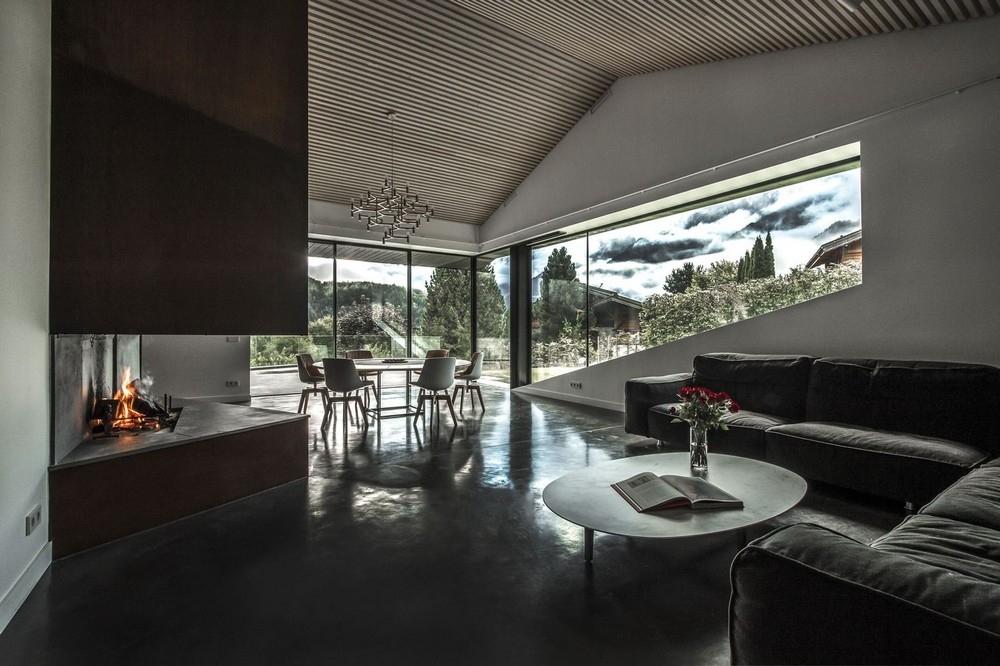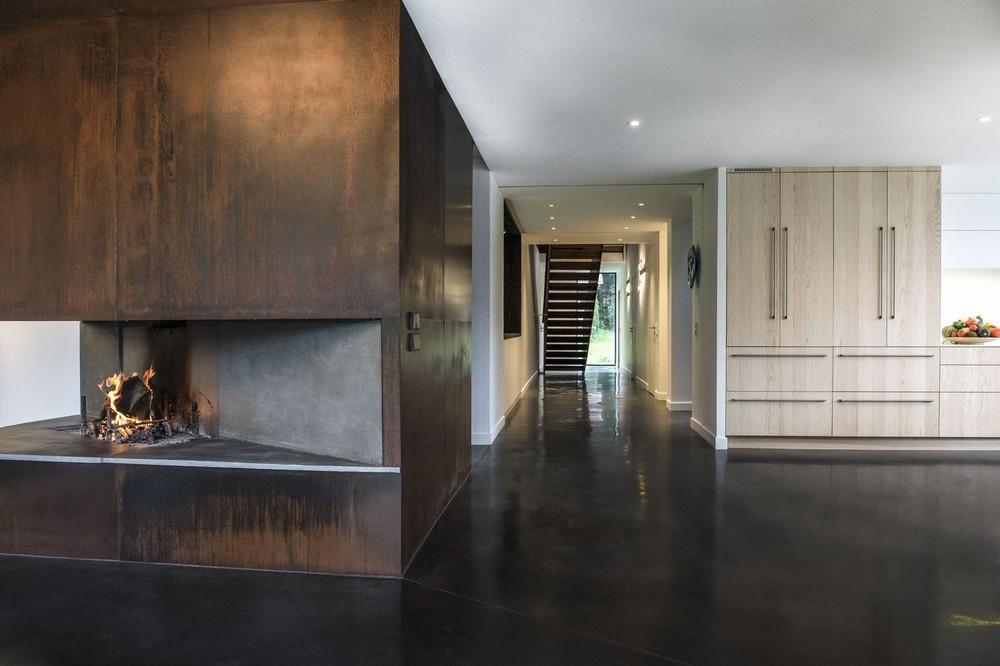 В результате получился духэтажный дом из деревянных конструкций с каменным цоколем. Снаружи дом отдела обугленным кедром, имеет бетонные полы и камин, облицованный чёрным ржавым металлом. Построен дом за 9 месяцев.