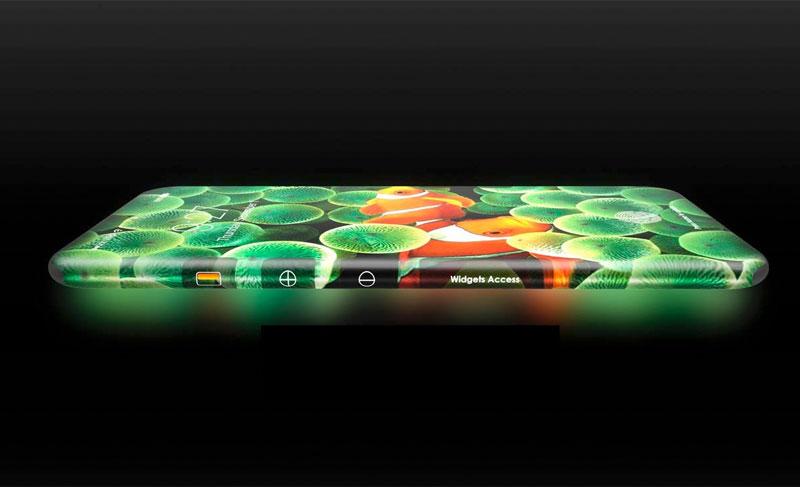 Аппарат выглядит довольно изящно, но насколько практична такая дисплейная панель, пока судить сложно. На сенсорные боковые грани дизайнер вынес управление функциями устройства, такие как запуск приложений, фонарика, камеры и т.п. Кнопки регулировки громкости и выключения звука также сенсорные.