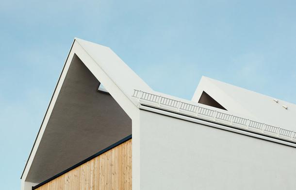 Дом-матрешку довольно плотно окружают такие же жилые дома со скатными крышами, и архитекторам было выделено под застройку крайне узкое место. Поэтому они решили создать “стройное” здание с фасадом, обращенным к улице.