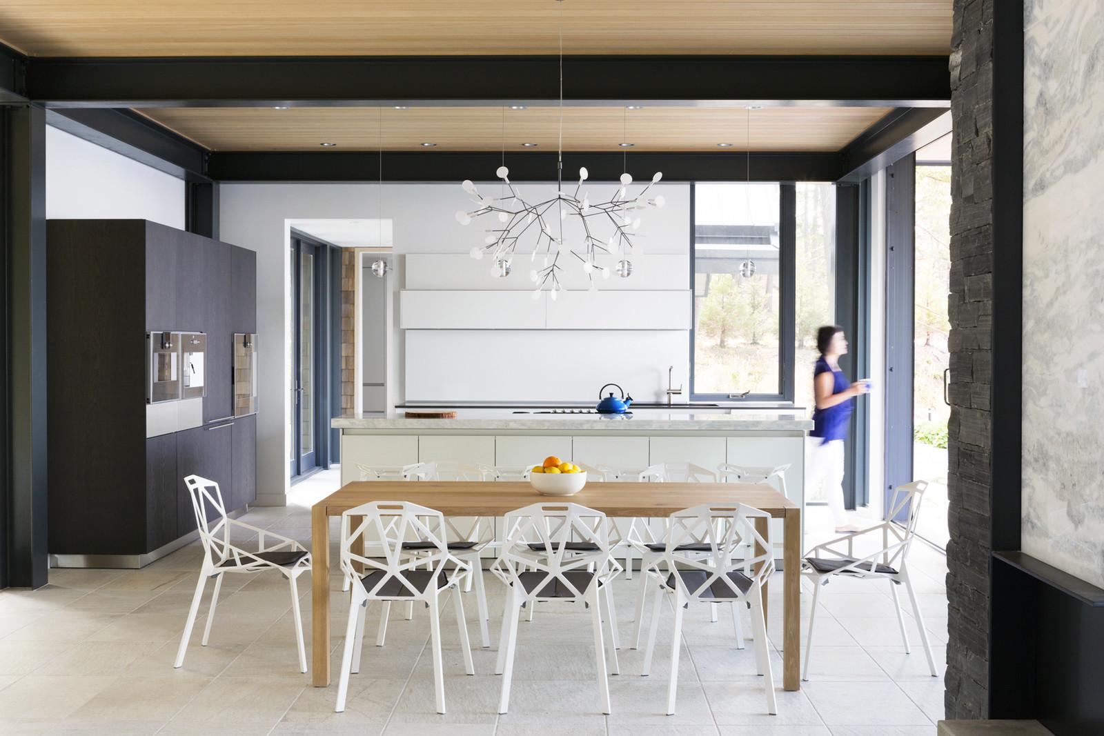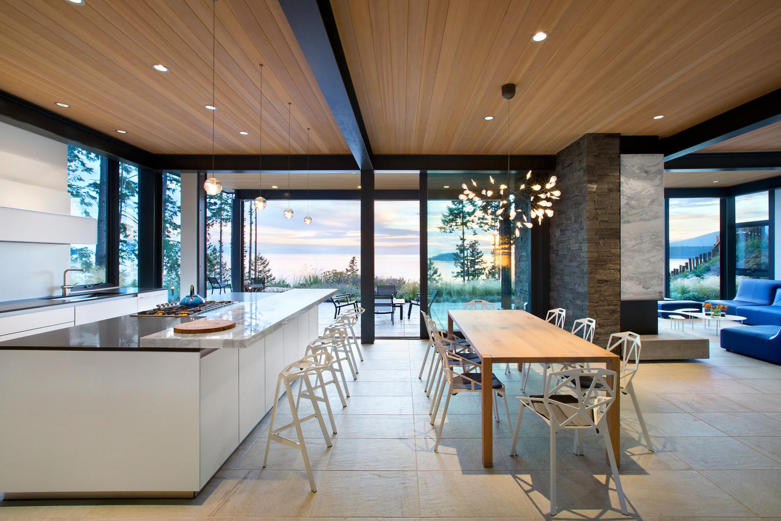 Общественные функции сосредоточены в зоне открытой планировки, расположенной в центральном здании, совмещающей в себе кухню, столовую и гостиную. Спальня хозяев и гостевые комнаты находятся в боковых зданиях. Раздвижные стеклянные двери от пола до потолка в зоне кухни и столовой продлевают пространство гостиной на террасу с открывающимся оттуда панорамным видом океана.