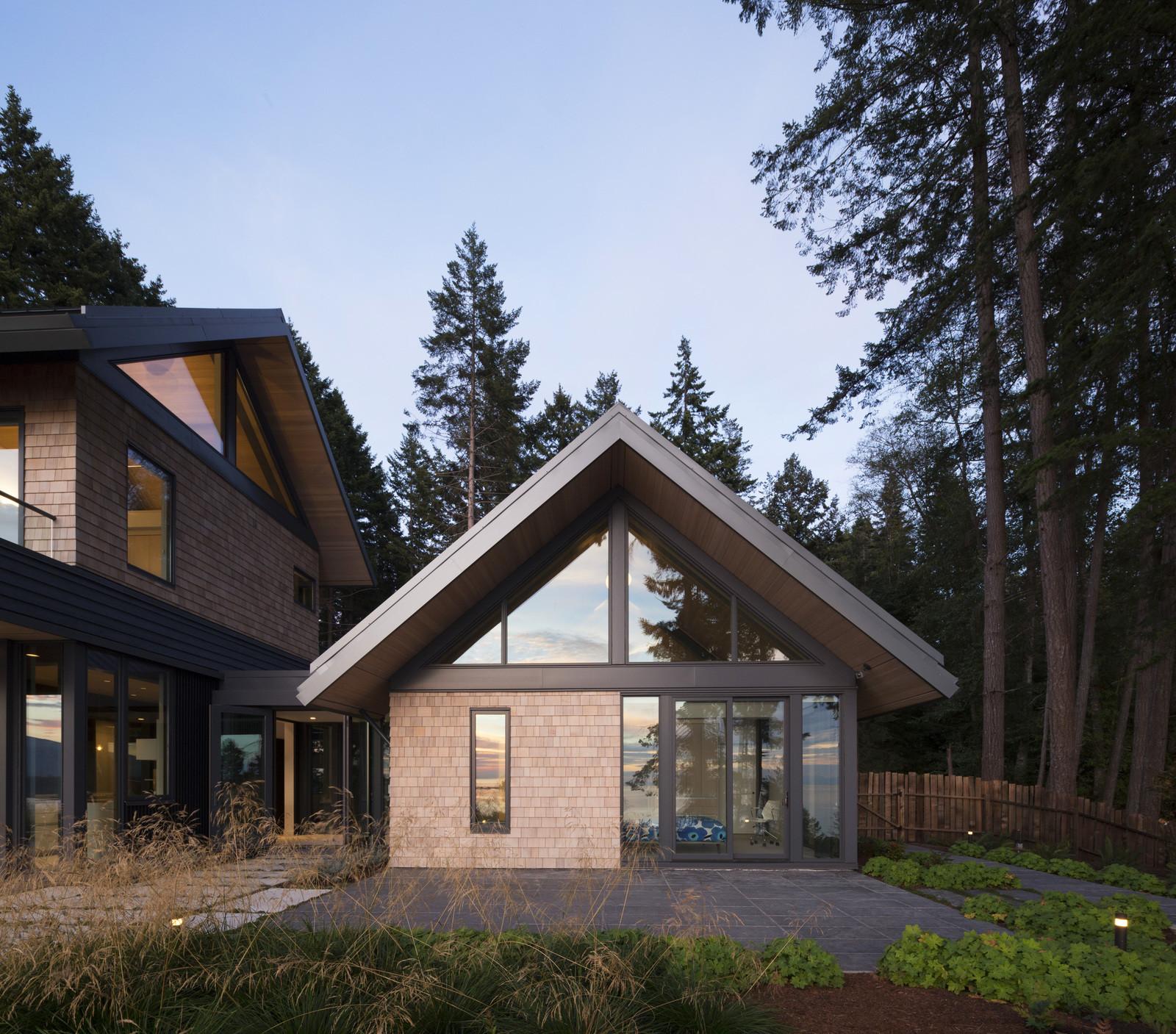 При строительстве были выбраны местные материалы, характерные для домов этого региона — кедровая облицовка фасадов и природный камень в качестве фундамента здания. Большие консольные двускатные крыши с кедровыми балками соответствуют форме традиционной уединённой хижины. Детализированные цинковые фасции придают линиям крыш современный вид.
