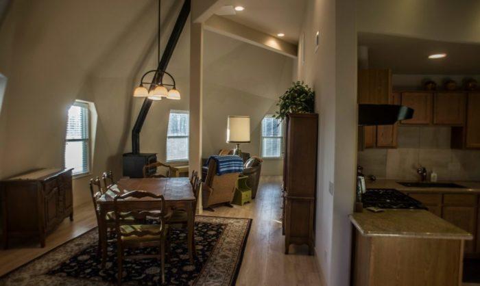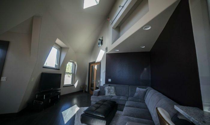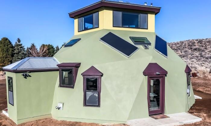 Из-за оригинальной формы дома для его обогрева достаточно всего одной пеллетной печи (даже в условиях сильных морозов). Снаружи декагон обшит водонепроницаемым покрытием, а на крыше установлены солнечные панели, благодаря которым дом может не зависеть от городских электросетей.