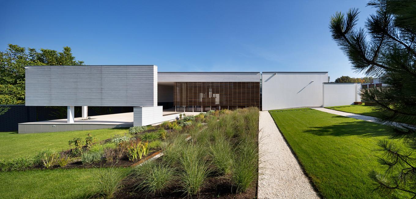 Летом зона отдыха продолжается в открытой части с бассейном, лаунджем и барбекю. Чтобы сделать это пространство максимально удобным, на окнах установлены постоянные жалюзи, защищающие от неблагоприятных солнечных лучей и поддерживающие визуальную связь с садом.