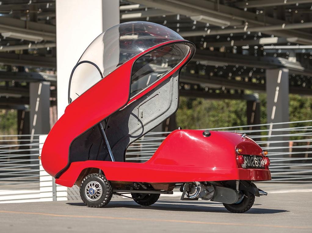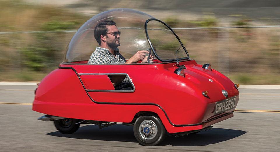 Вместо дверей и окон у Peel Trident предусмотрен откидной стеклянный колпак, как в самолете-истребителе. 49-кубовый одноцилиндровый двигатель мощностью 4,2 л. с. работает в паре с 3-ступенчатой механической КПП и позволяет разогнаться до 45 км/ч. Расход топлива при этом не такой уж и маленький – 2,8 л/100 км.