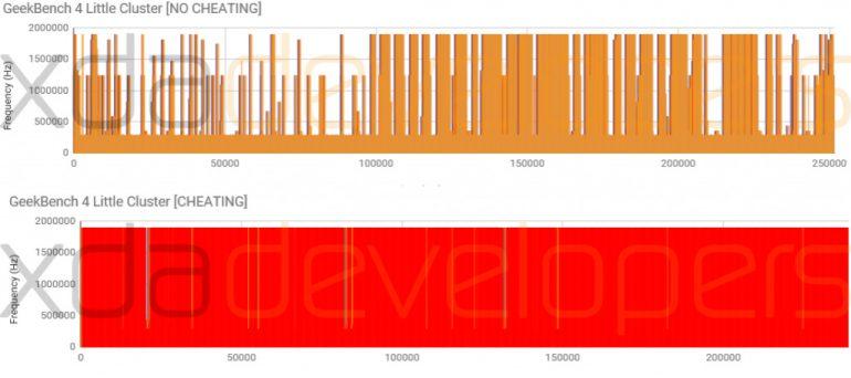 Отмечается, что встроенное программное обеспечение смартфона определяет, когда на нём запускаются тестовые приложения, после чего повышает частоту процессора до максимального значения 1,9 ГГц. В таком режиме процессор работает практически на протяжении всего времени тестирования.